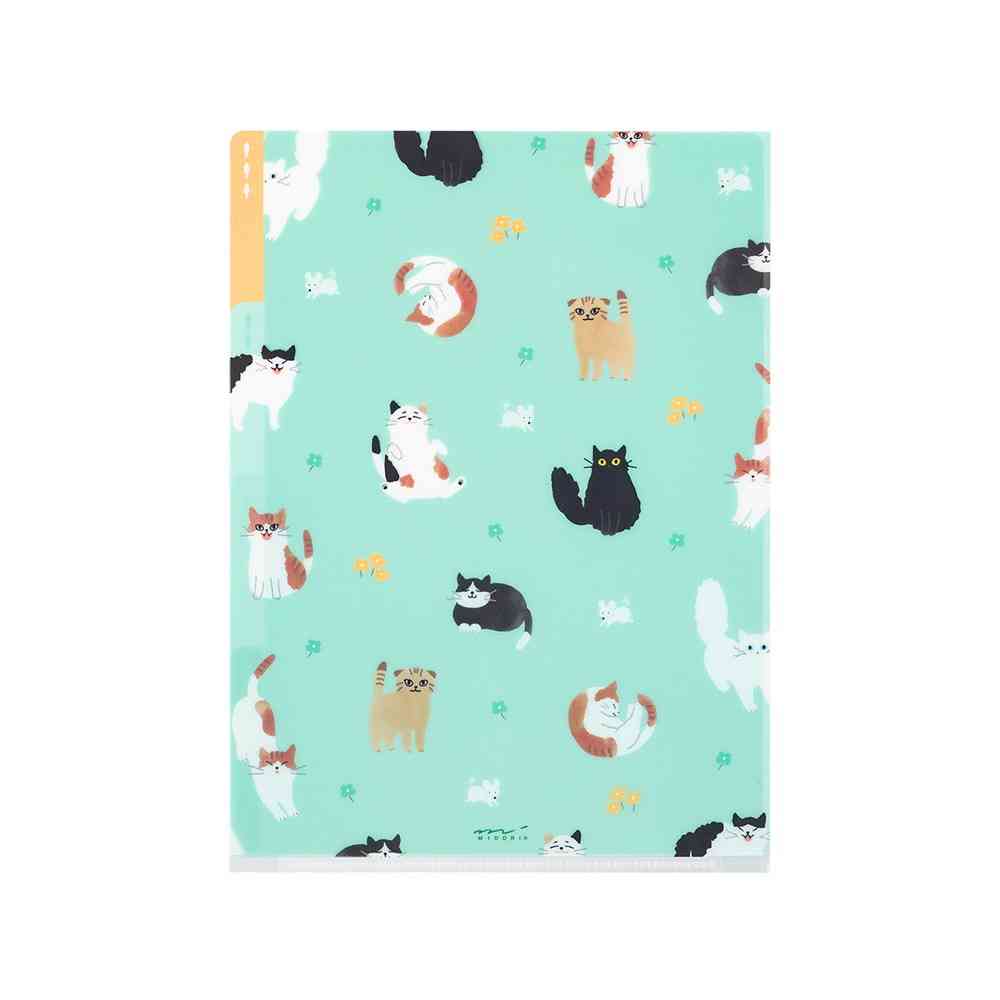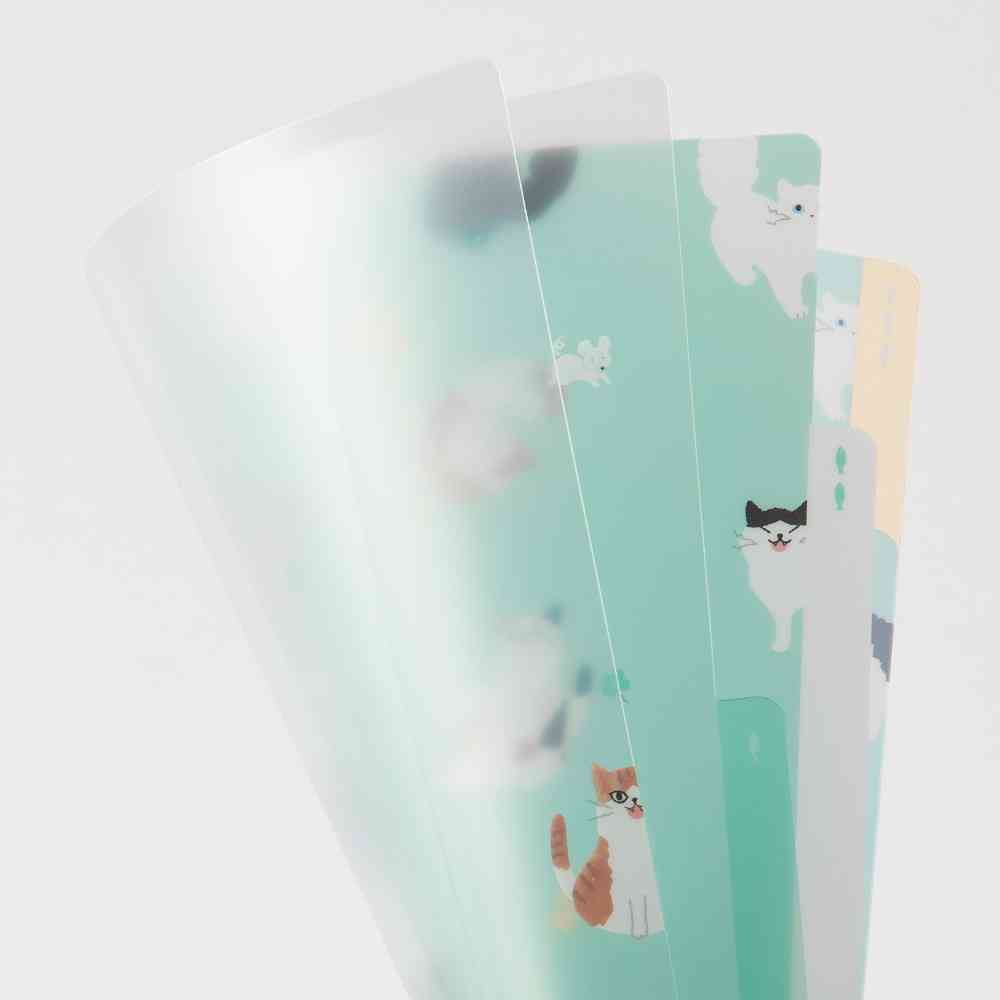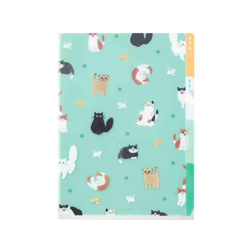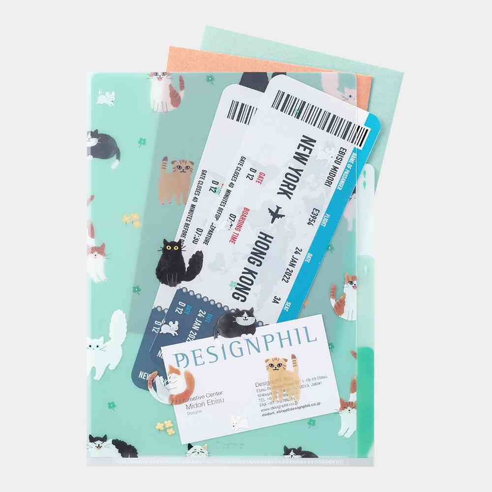 用途ごとに書類をざっくり仕分けられる3ポケット仕様のクリアホルダーです。 大きめのチケットやパンフレット類の収納にも便利。 持ち歩きやすいA5サイズです。 優しい手書き風のタッチでネコたちの可愛いポーズをデザインした柄です。