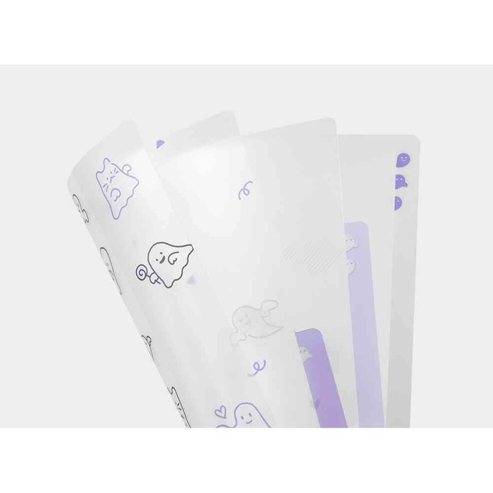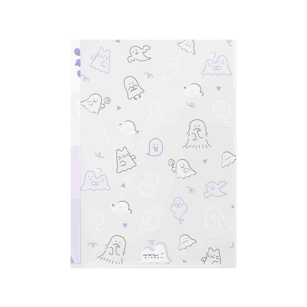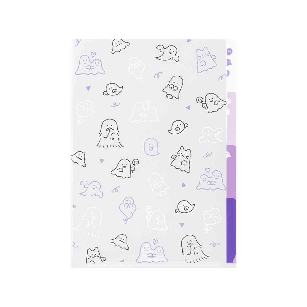 右端が大きく開き、書類の出し入れがスムーズ。 ポケットにはインデックスがついているので用途ごとに整理したり、書類を探すのにも便利です。 大きめのチケットやパンフレット類の収納にも便利で、持ち歩きやすいA5サイズです。 ユニークなおばけたちと本体のクリア素材がマッチした、ポップなデザインです。