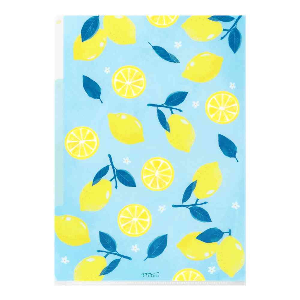 右端が大きく開き、書類の出し入れがスムーズな、3ポケット仕様のクリアホルダーです。 ポケットにはインデックスがついているので用途ごとに整理したり、書類を探すのにも便利です。 A4は書類の分類に最適で、仕事に、家庭に、勉強に、汎用性が高い定番サイズです。 爽やかなブルーの背景に手書き風のレモンが散りばめられた、かわいらしいデザインです。