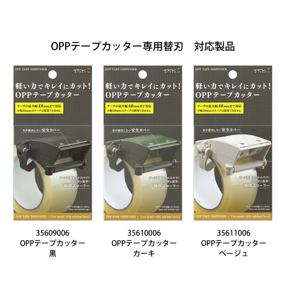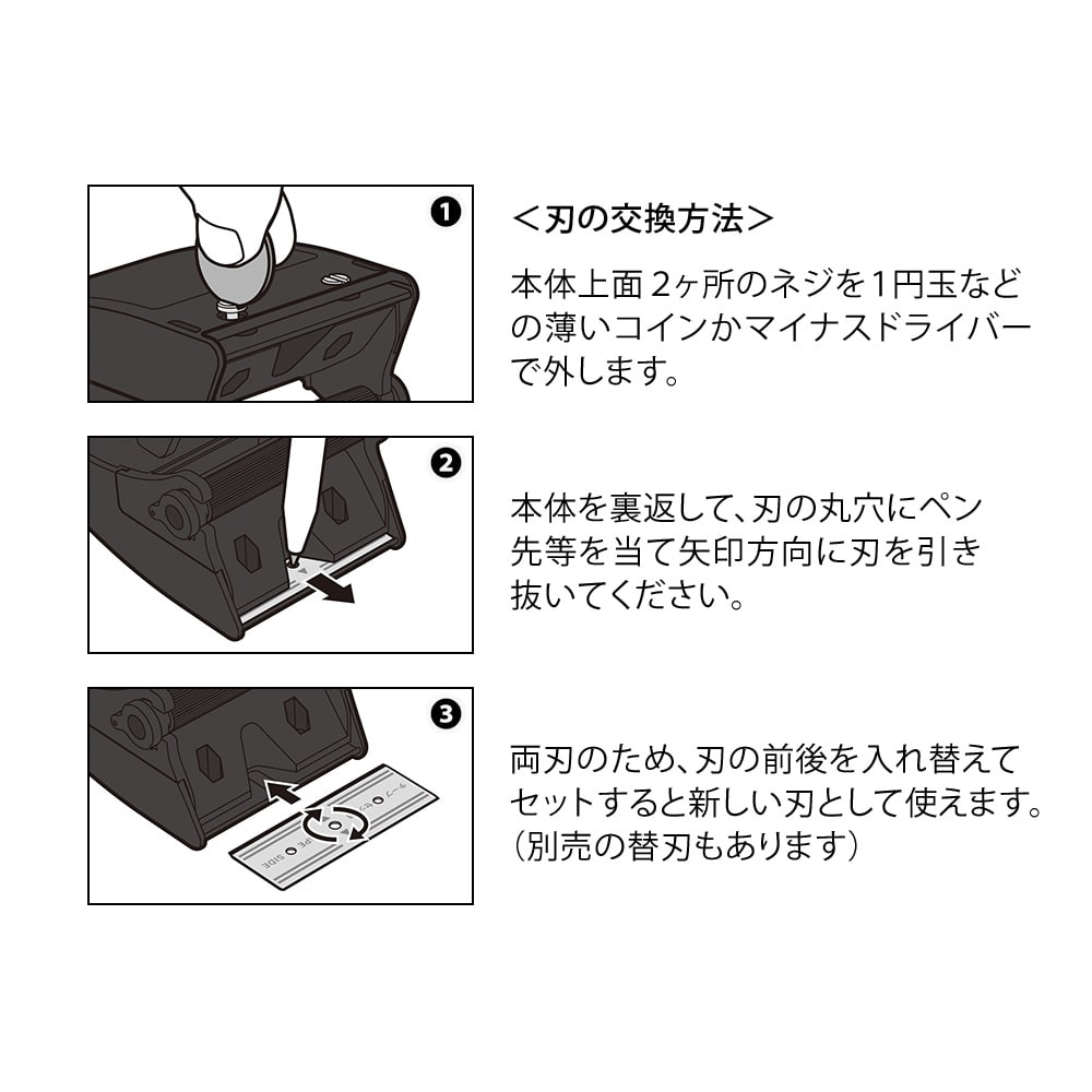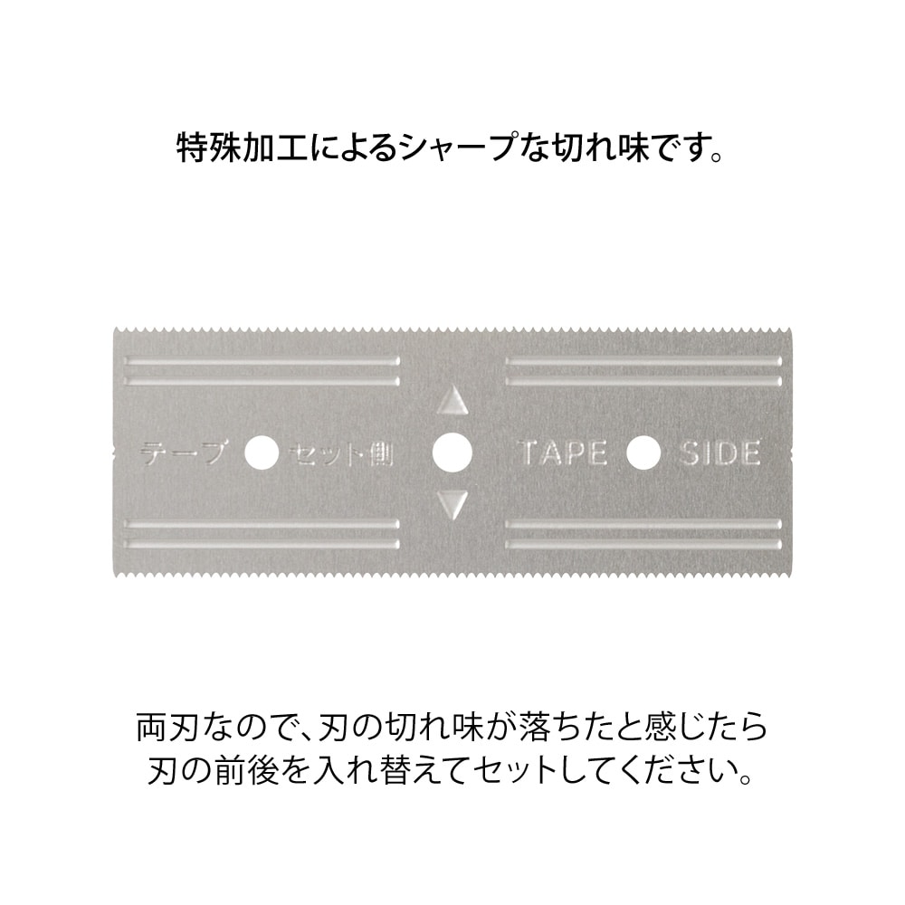 OPPテープカッター専用の替刃です。本体上面2ヵ所のネジを1円玉などの薄いコインかマイナスドライバーで外し、本体を裏返して、刃の丸穴にペン先等を当て矢印方向に刃を引き抜き抜いて新しい刃をセットします。 両刃のため、刃の前後を入れ替えてセットすると新しい刃として使えます。