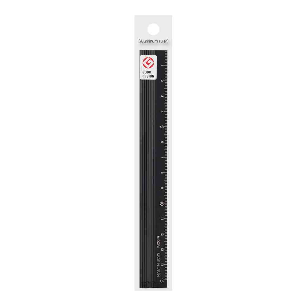 カッターにも強いアルミ製の、シンプルな15cm定規。 長く使っても消えないレザー刻印目盛り。