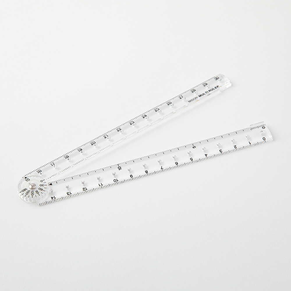 開くと30cmまで測れて、折りたためばペンケースの中に収まるコンパクトな定規。 高さや奥行きが測りやすいグランドポイントの目盛り付き。 15度ごとにカチッととまり、角度も測れます。 1cmごとに穴があいているので、等間隔で印をつけるのにも便利。 まさに「マルチ」に活躍する定規です。