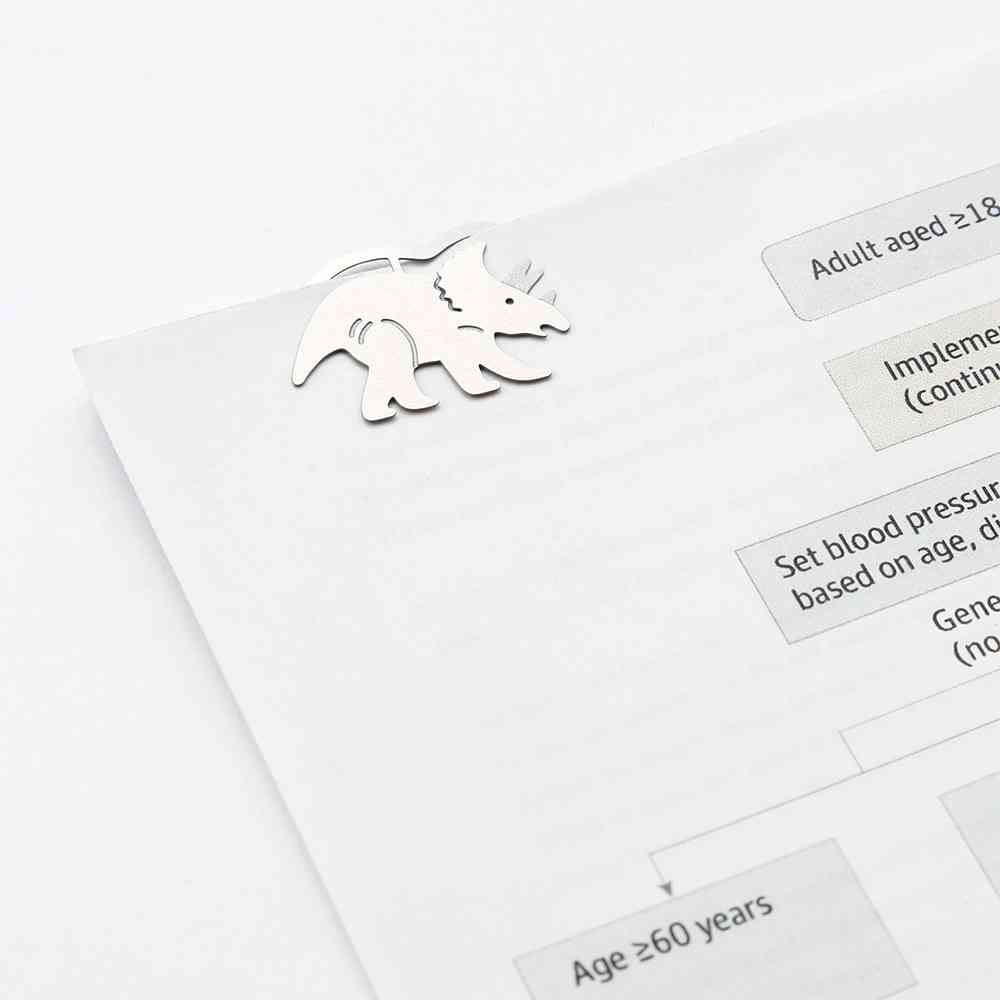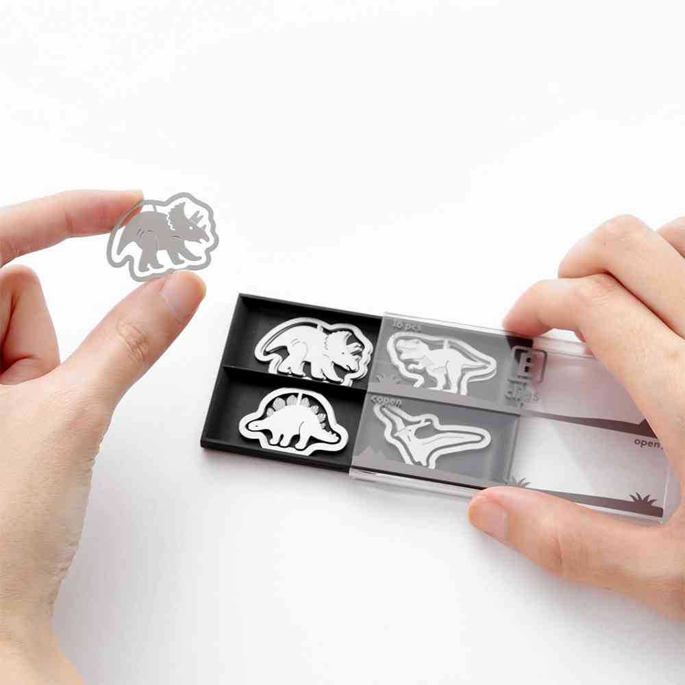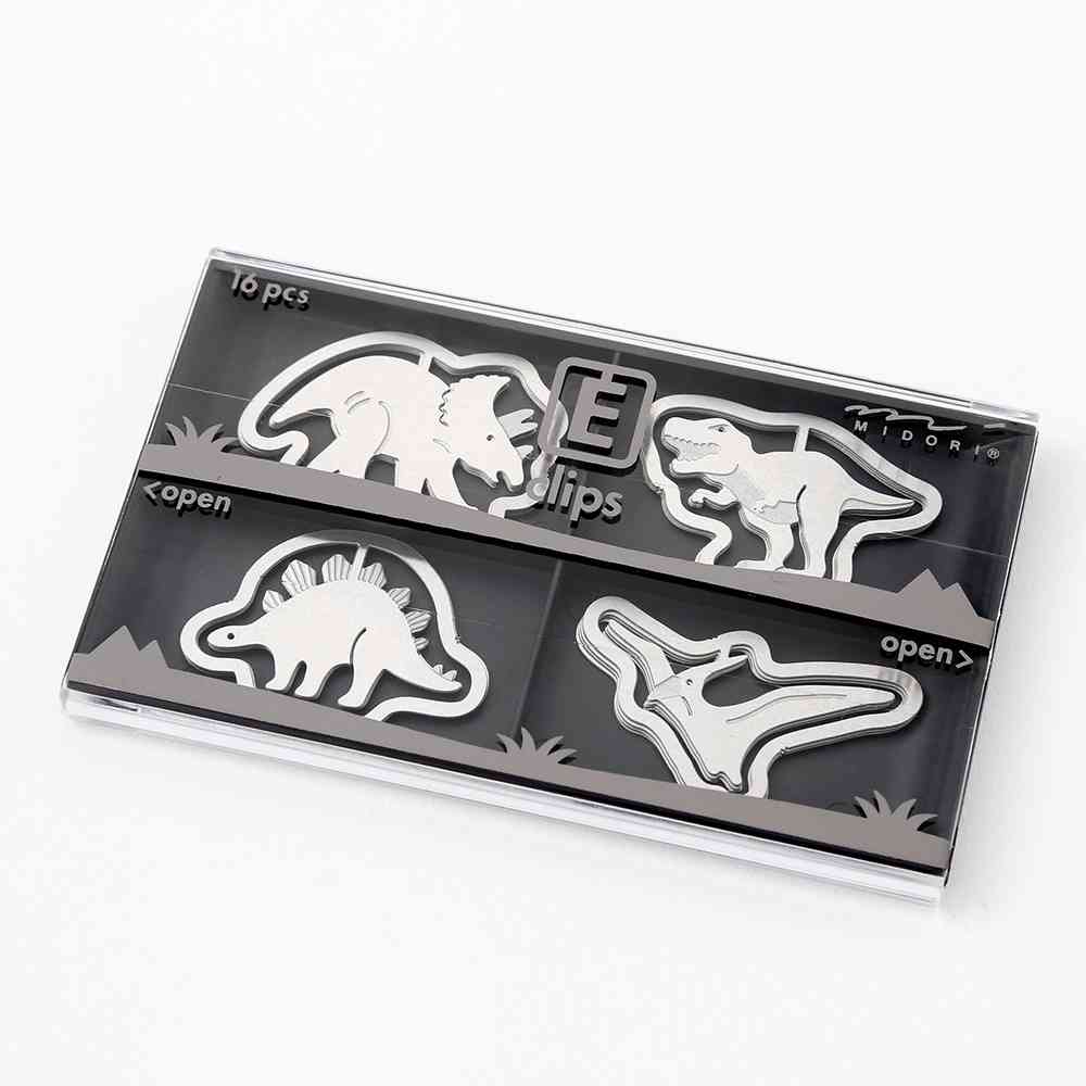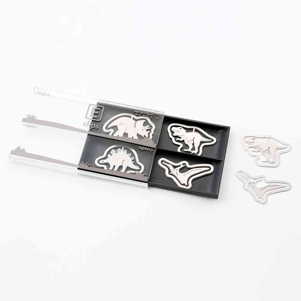 繊細な加工でさまざまなモチーフを表現したステンレス製のデザインクリップです。 コピー用紙を約10枚までしっかりと留められます。 トリケラトプス、ティラノサウルス、ステゴサウルス、プテラノドンの4種各4個入。