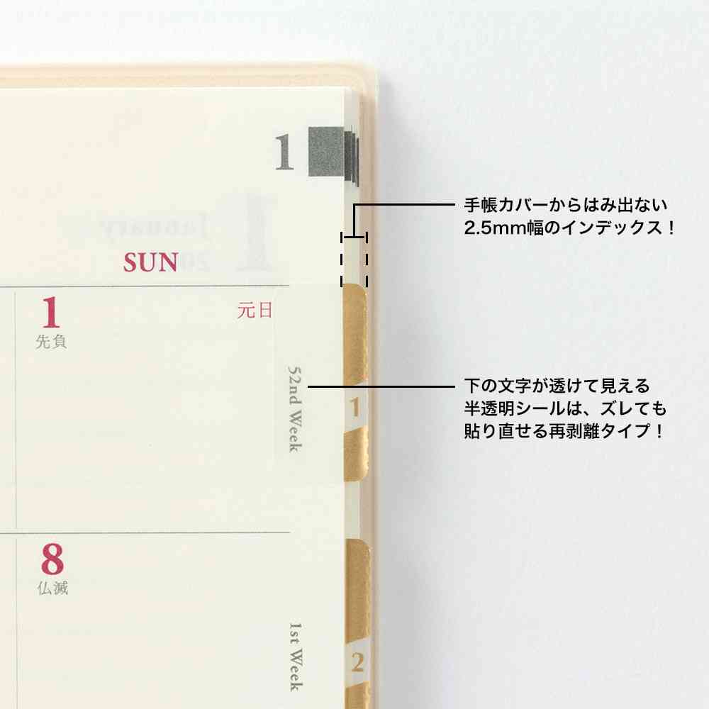 手帳をきれいにまとめるチラッと見えるインデックスラベル。 インデックスが傷まないよう最小限の飛び出しで表示します。