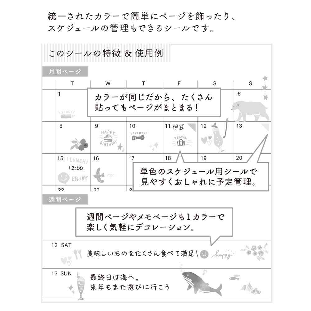 手帳の余白や日付を楽しく飾る、貼ってはがせるシールです。 ライン状に重ねて貼って、メモページの余白や見出しを賑やかに飾ることができます。 同系色でまとまっているので、アレンジが苦手な方でも簡単にページに統一感があるページを作成できます。
