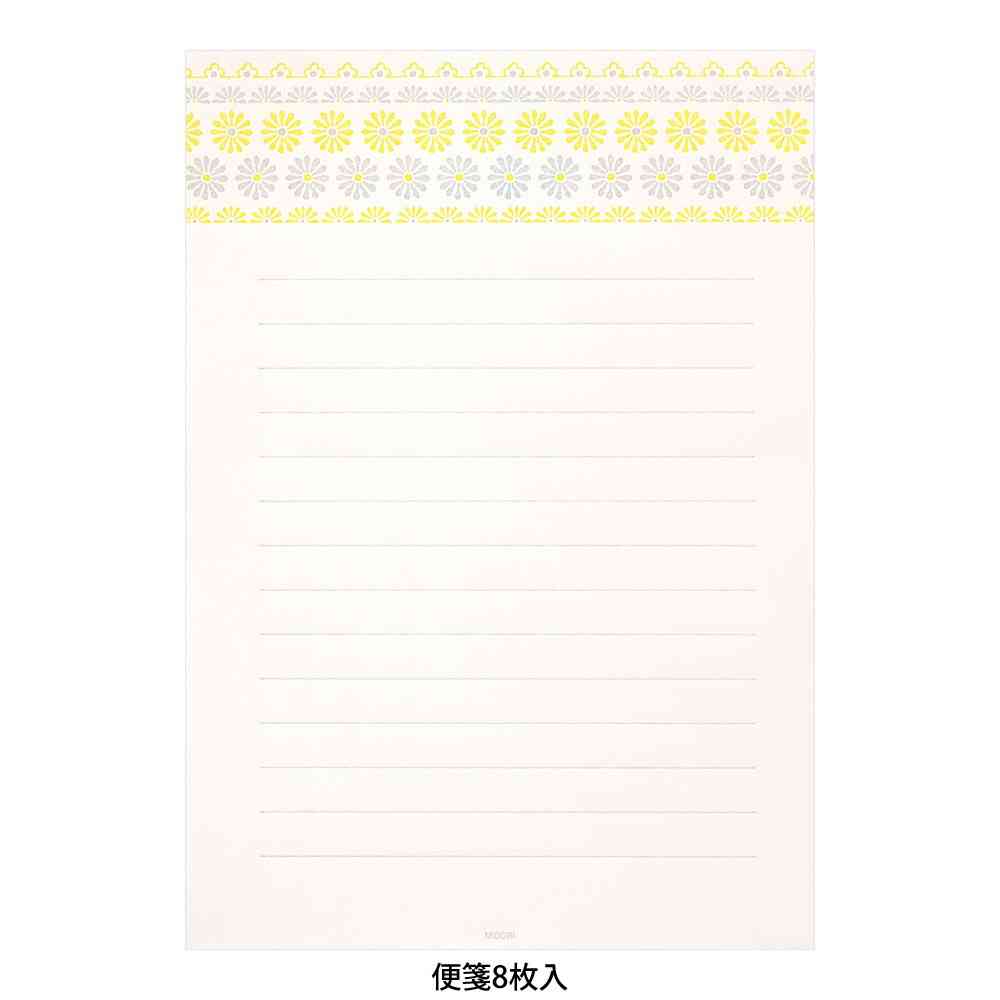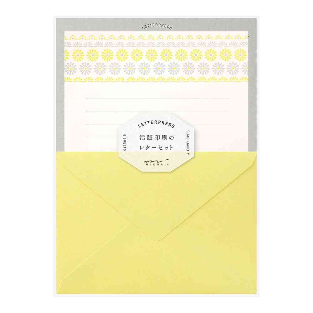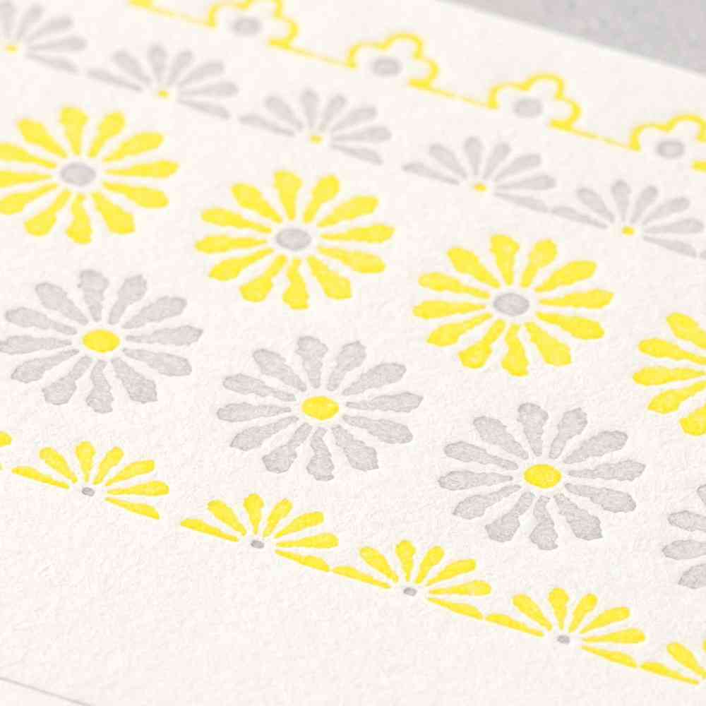 大人の女性のための上品で上質な活版印刷のレターセットです。 活版印刷ならではの繊細な手触りと美しい陰影をお楽しみいただけます。 モダンな黄色とグレーの組み合わせ花ライン柄は、様々なシーンで活躍します。