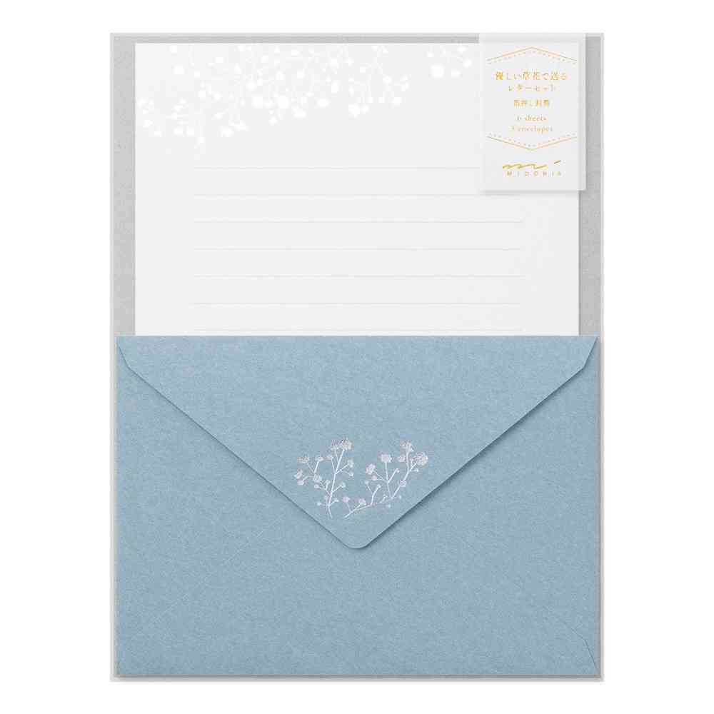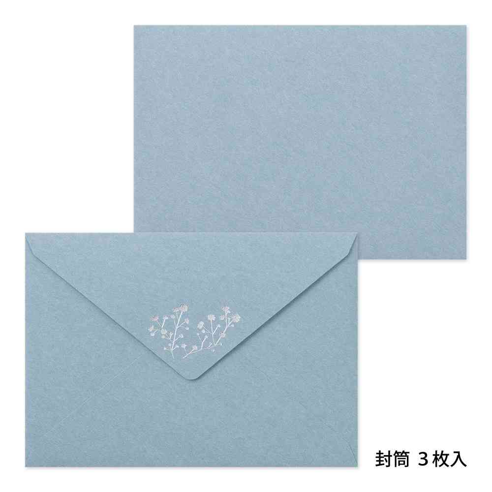 優しい草花で送る少し大人なレターセット。 封筒のフラップ部分にあしらわれた箔のデザインが、手紙が届いた時の高揚感を演出します。 ブーケにも添えられるかすみ草の繊細さを表現するため、かすみ草のみ銀箔押しにしています。 記念日や誕生日などちょっとしたお祝いごとのお手紙にぴったりです。