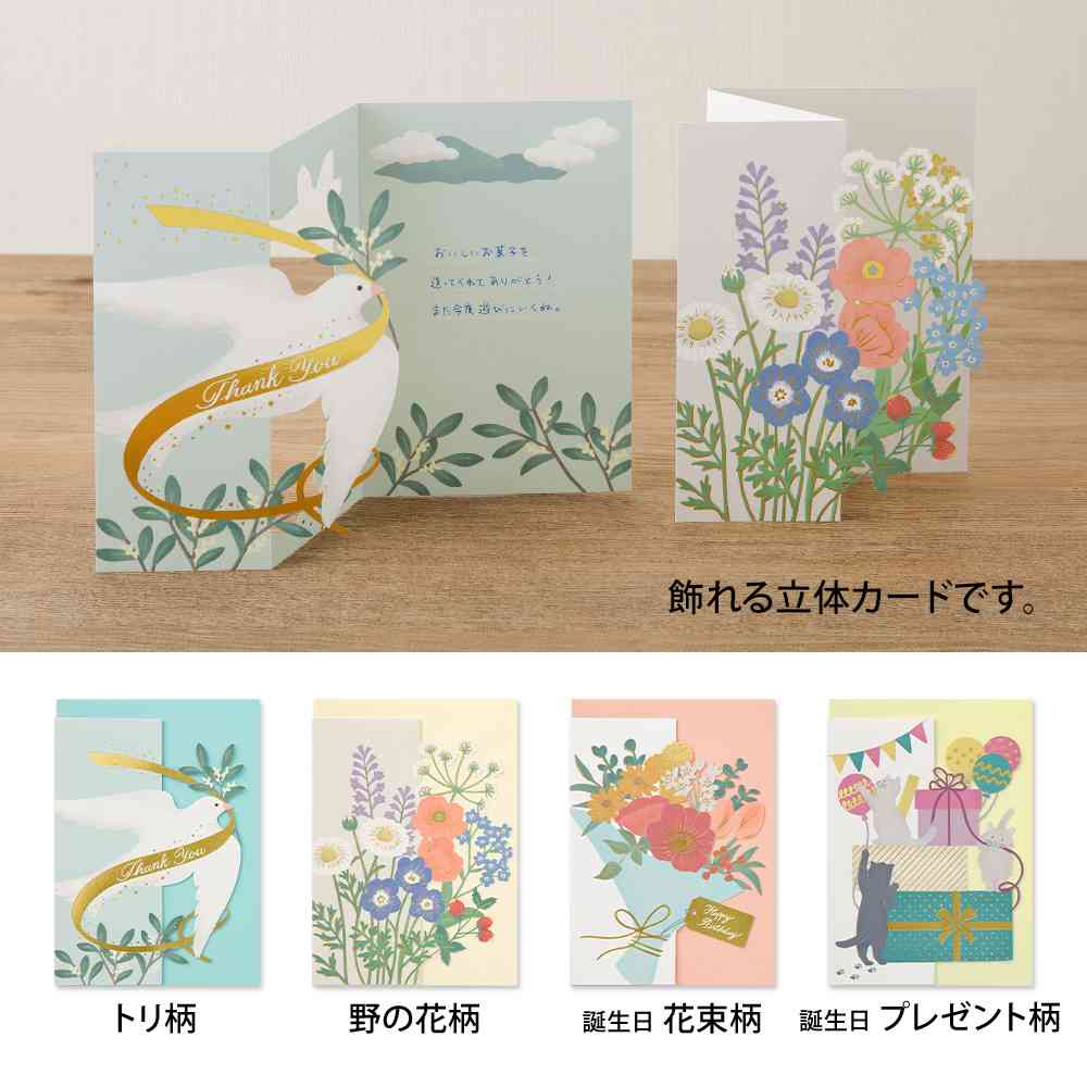3つ折りになっており、少し開いて立てることができるグリーティングカードです。立てたときには、メッセージ部分が正面からは見えにくい構造。いただいた方に、部屋に飾って楽しんでいただける立体的なデザインです。 花束が飛び出すような華やかな絵柄で、老若男女に使いやすい定番のお祝いモチーフです。
