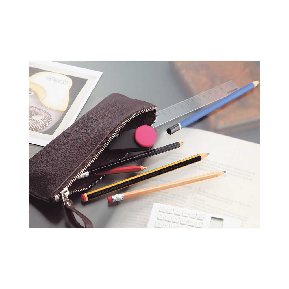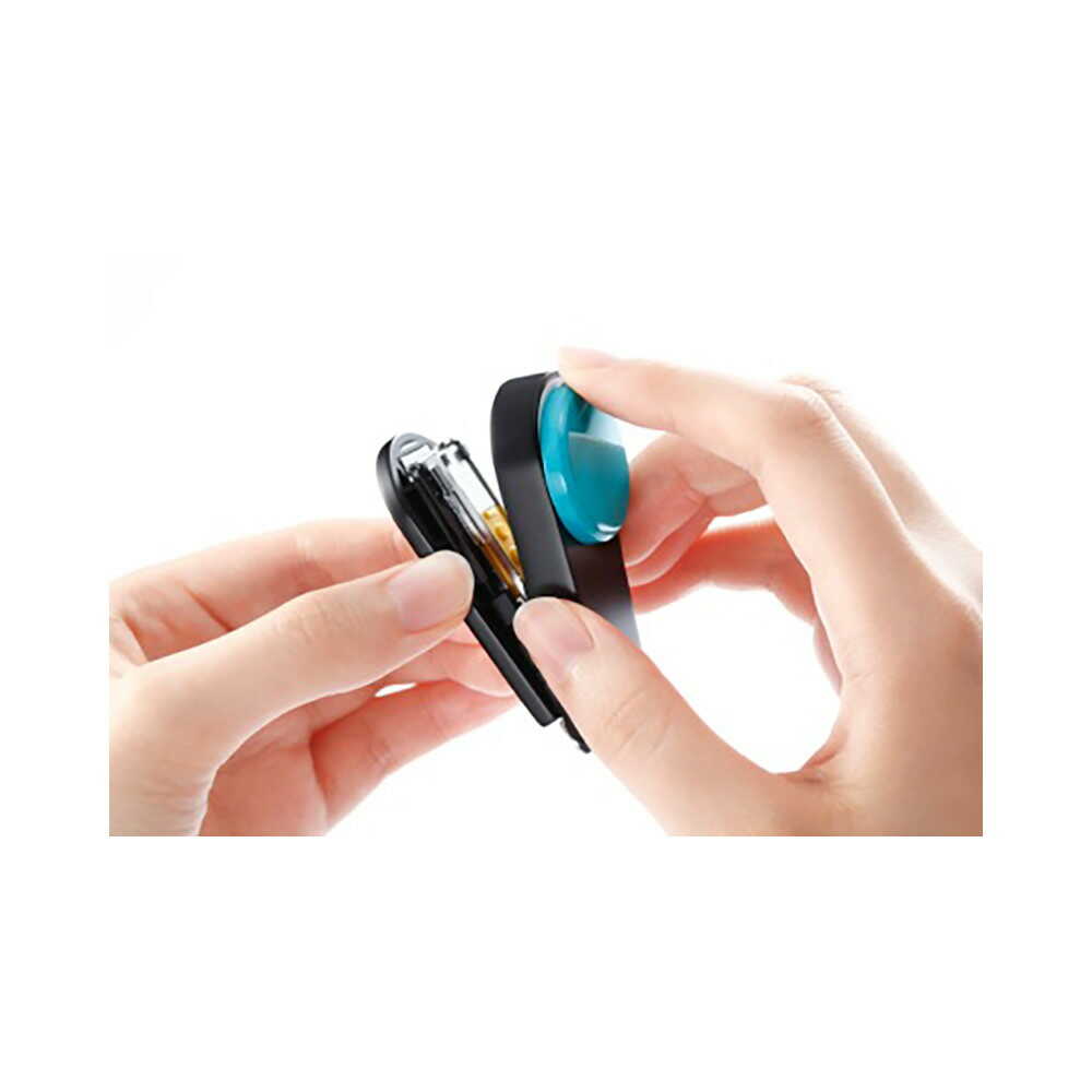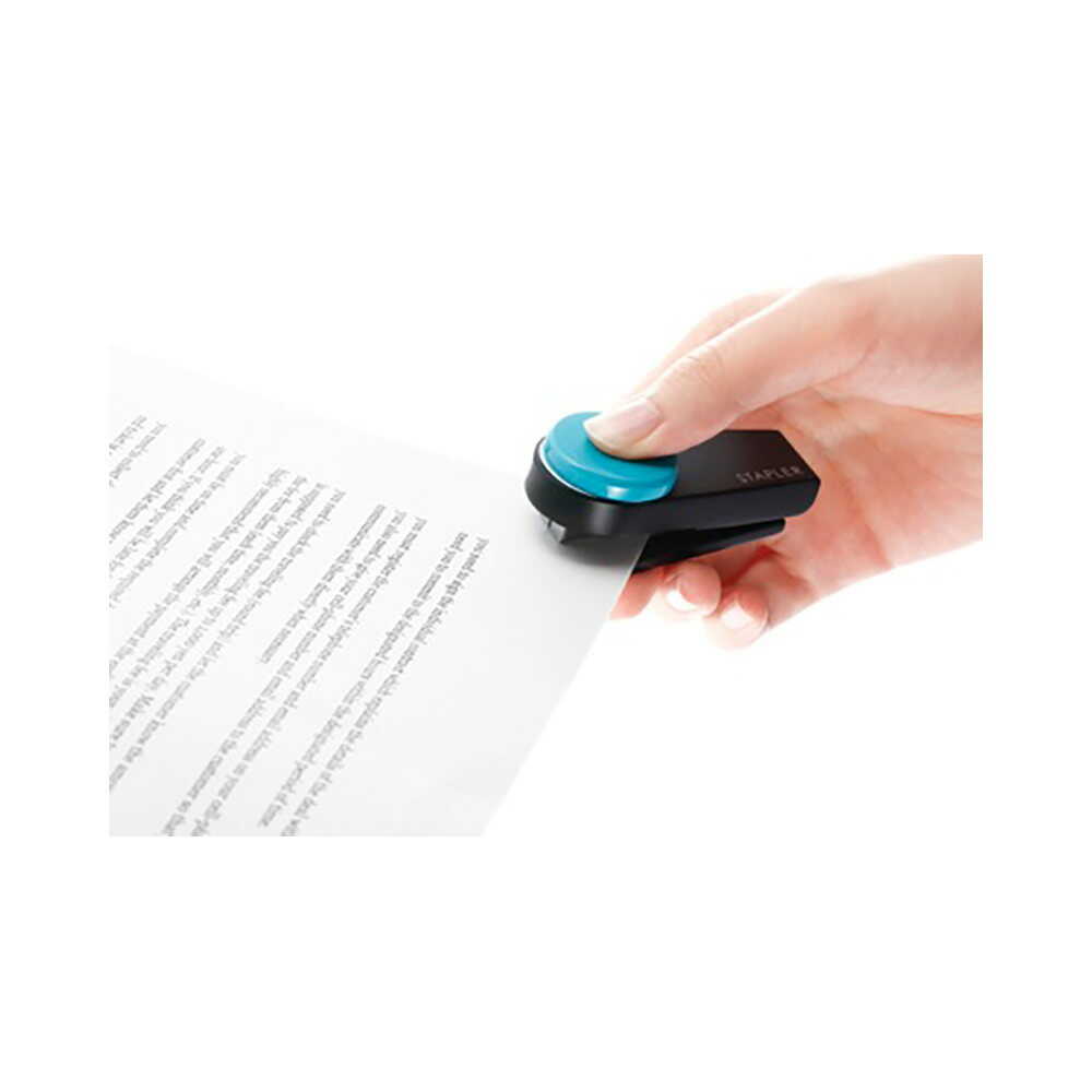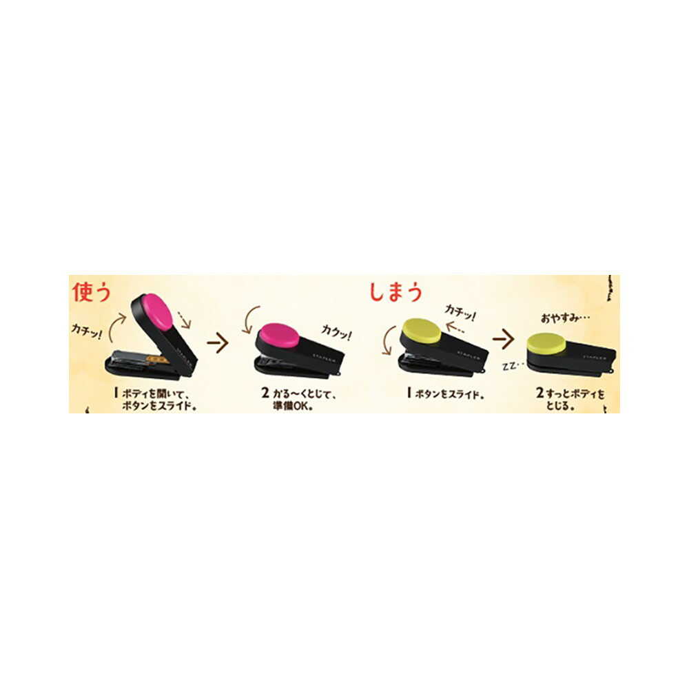 【10枚とじ】 カラーボタンが特徴の携帯できる小型ホッチキス。 針が装てん済みですぐに使える。 ペンケースや化粧ポーチにも収まるサイズ。