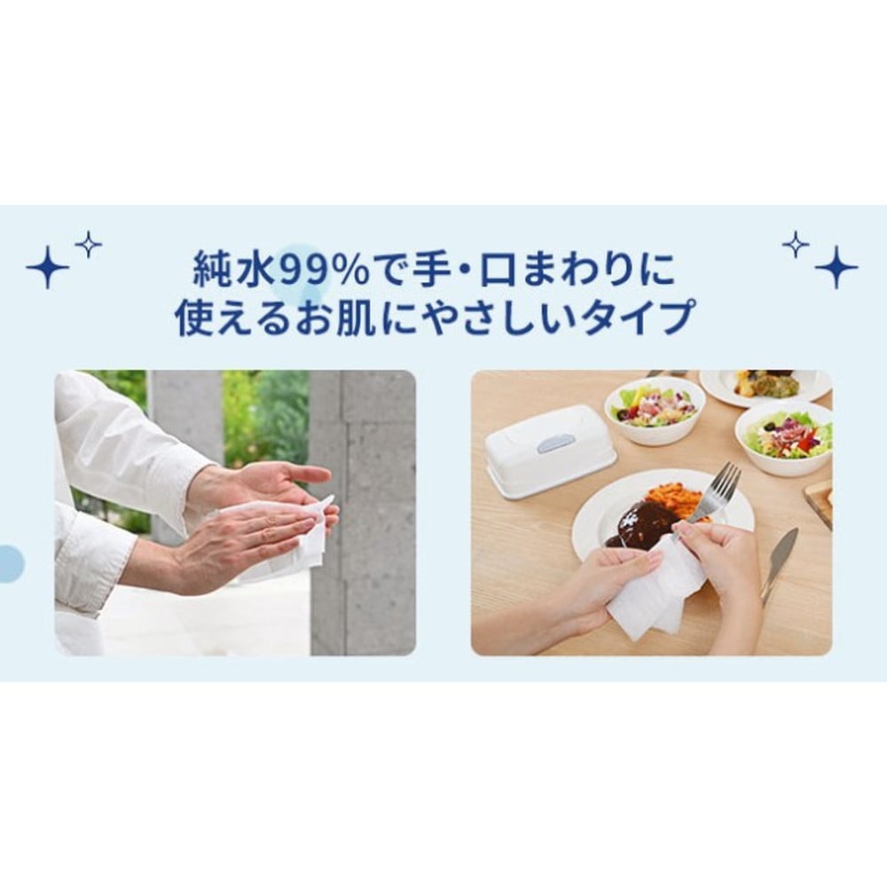 ワンプッシュでフタが開いて、片手でシートが取り出せるから、身の回りを手早くキレイにできるウェットティッシュの詰め替え用です。 純水99%、ノンアルコール、無香料。