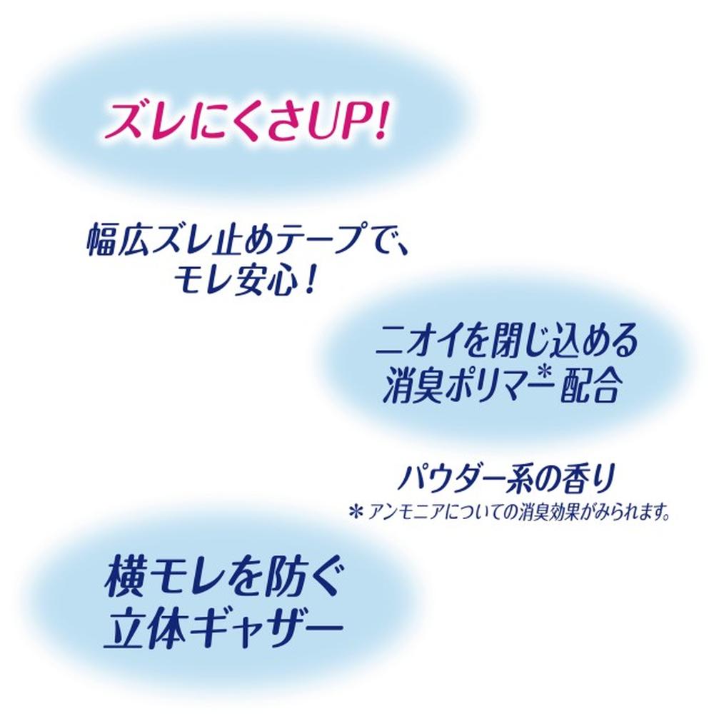 ●すばやく吸収、モレ安心のナプキン型尿ケアパッドです。 ●なみなみシートを採用。水分を素早く引き込むから、表面はいつもサラサラ。 ●真ん中ふっくら吸収体を搭載。ヨレずに体にフィットするから多くてもモレ安心。 ●ニオイを閉じ込める、消臭ポリマー配合。(※アンモニアについての消費効果がみられます。) ●パウダー系の香り。 ●長時間・夜でも安心用 (吸収量:170cc/長さ:29cm) ●32枚入<