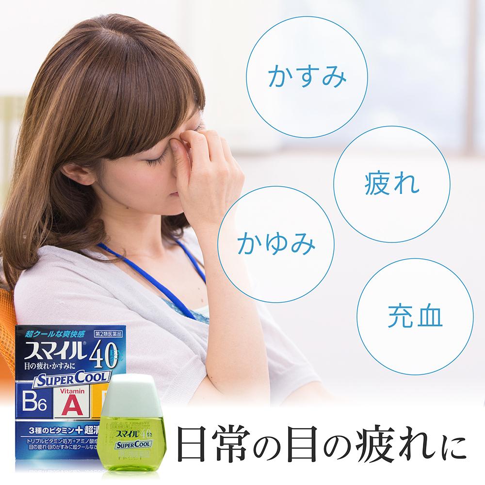 ・使用方法を守ってご使用下さい。 ・過度にしようすると異常なまぶしさを感じたり、かえって充血を招くことがあります。 ・パソコンや携帯電話、TVなどの画面を見る機会が多い方は、1時間に10~15分は目を休めましょう。 ・お使いになって何か気になる症状が出た場合は、使用を中止し、医師・薬剤師・登録販売者にご相談下さい。 ・使用前に、よく添付文書をお読みになってからご使用下さい。 ・その際、ご不明な点がございましたら、薬剤師・登録販売者にご相談下さい。商品説明●スマイル40EXシリーズで最高レベルの清涼感 ●疲れ、かすみ、かゆみ、充血に