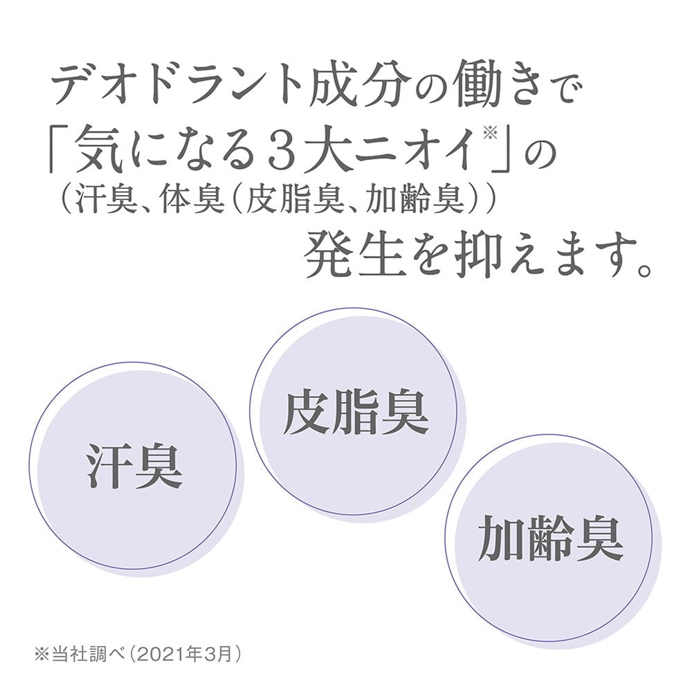 気になる3大ニオイ(汗臭、皮脂臭、加齢臭)をしっかり抑える本格デオドラント効果と、吸着保湿テクノロジーによる保湿効果を両立する、うるおいデオドラント