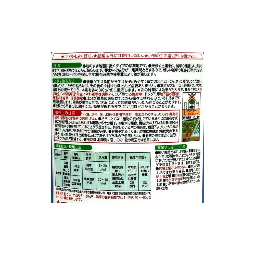 ●ラベルをよく読む●記載以外には使用しない●小児の手のとろく所には置かない 【散布上の注意】 ●花壇、畑、水田(休耕田含む)、樹木などの枯らしたくない植物の周り、傾斜地では使用しない。●枯らしたくない植物の根が生えている場所には散布せず、根が張っていると思われる場所から十分離す。※樹木の場合、横枝が伸びている距離(樹冠下)までは地中で根が伸びていると考えられる。剪定している木の場合は樹冠下よりも根が伸びている場合があるので、より中が必要。●水たまりがひかないようなときや、地面にまいた粒が流されてしまうような豪雨が予想される場合、散布を控える。(軽い降雨であれば効果に影響はない。)●散布予定地より低い位置に農耕地や枯らしたくない植物がある場合、成分が流出する可能性があるので散布しない。●散布の際は周辺住民に一声かけるなど、配慮する。●特に松は除草剤に弱いので、松の周辺では使用しない。 【効果・薬害等の注意】 ●植栽地を除く樹木等の周辺地で使用する場合は、薬剤が樹木等の植栽地に流入または飛散するおそれがある場所等では使用しない(薬害)●本剤が植物の根から吸収されると薬害が発生するので、水田や水田への利用が考えられる用水路等に本剤の流入が想定される場所や、農作物および樹木等有用植物の付近では使用しない(薬害)●本剤が流出するような激しい雨が想定される場合は散布を行わない。●傾斜地や砂質土壌では、本剤の流出による薬害のおそれがあるので使用しない(薬害)●本剤を散布した場所やその付近では、有用植物の根付けは行わない(薬害)●ハウス等の施設内およびその周辺では使用しない。●土壌が乾燥しているときは効果が劣る場合があるので、適度の湿り気のある時に均一に散布する(効果)●水源池、飲料水、灌漑用井戸、養殖池等に本剤の飛散や流入及び浸透が想定される場所では散布を行わない。●散布器具、容器はよく洗浄し、洗浄廃液は直接河川や用水路に流れ込まないように十分注意し、環境に影響を与えないよう適切に処理する。●使用量に合わせ秤量し、使い切る。空袋、空容器は圃場などに放置せず、環境に影響のないよう適切に処理する。●使用量、使用時期、仕様用法を守る。