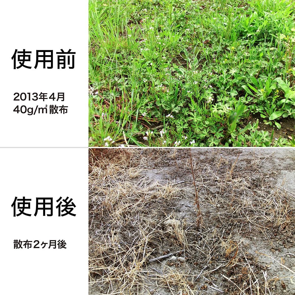 【効果についての注意】●ススキ、オギ等の大型イネ科雑草(多年生イネが雑草は適用外)、クズ等つる性植物、ドクダミ等 地下部が大きくなる植物、球根植物には効果が劣ります。●次のような土壌では効果が劣ります。(1)湿地帯、粘土質の土壌(2)砂利が厚く敷かれている土壌(3)落ち葉や枯れ草が堆積している土壌(4)小石や礫が多く混ざった、固い土壌※砂質土壌では使わないでください。●晩秋から早春にかけての低温期においては、雑草が枯れ始めるまでに1ヶ月ほどかかることがあります。