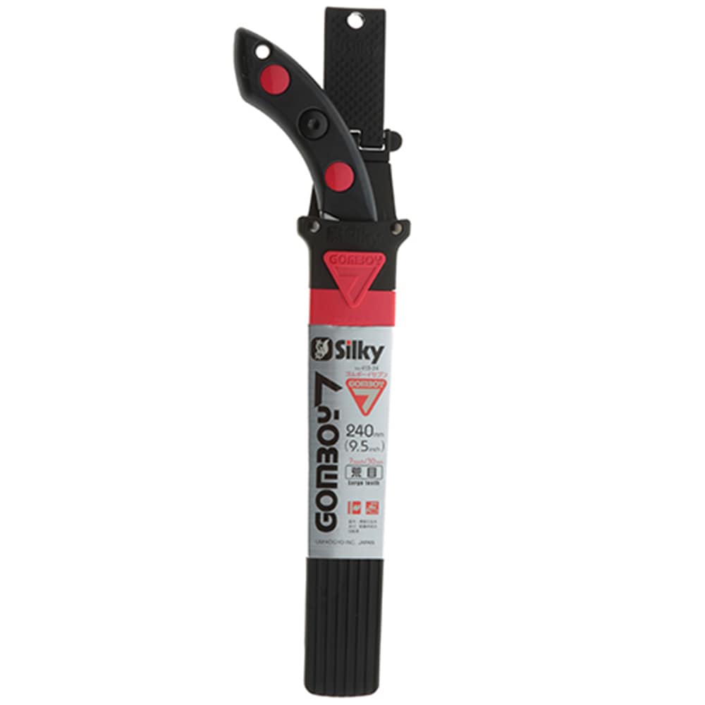 折込鋸ゴムボーイの刃が使える鞘入り鋸です。 生木の剪定用鋸。 ゴムボーイの刃を兼用できる鞘入り鋸です。 鏡面研磨仕上げにより、切断面が綺麗に仕上がります。 鞘はストッパー構造により、逆さにしても鋸が抜けにくくなっていますので安心して作業して頂けます。 外観は赤色を使い、シンプルですが、デザイン性が高い製品になっています。 ●刃長:240mm(荒目)。 ●目数(30mm):7枚目。 ●刃厚:1.4mm。 ●切幅:1.3mm。 ●全長:収納時420mm・使用時400mm。 ●重量:365g。 ●アサリ無し・衝撃焼入・未来目。 ●ゴムハンドル・ハードクロームメッキ。