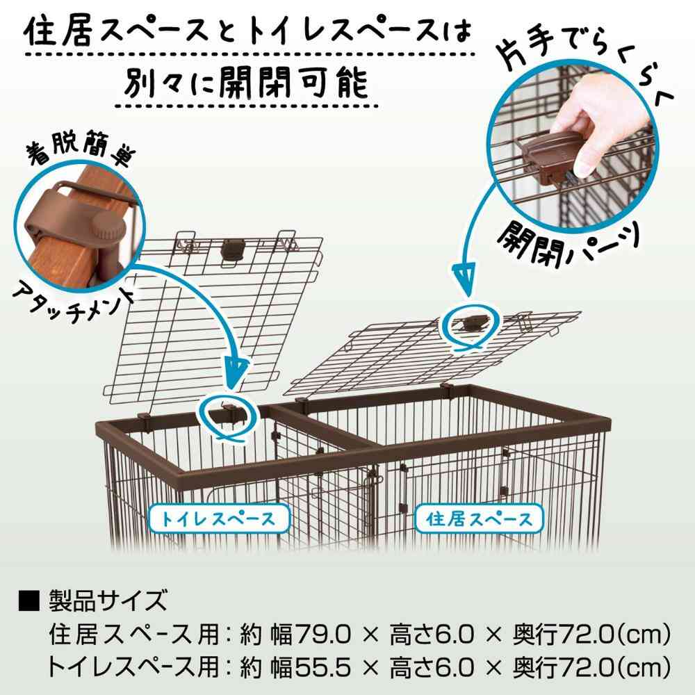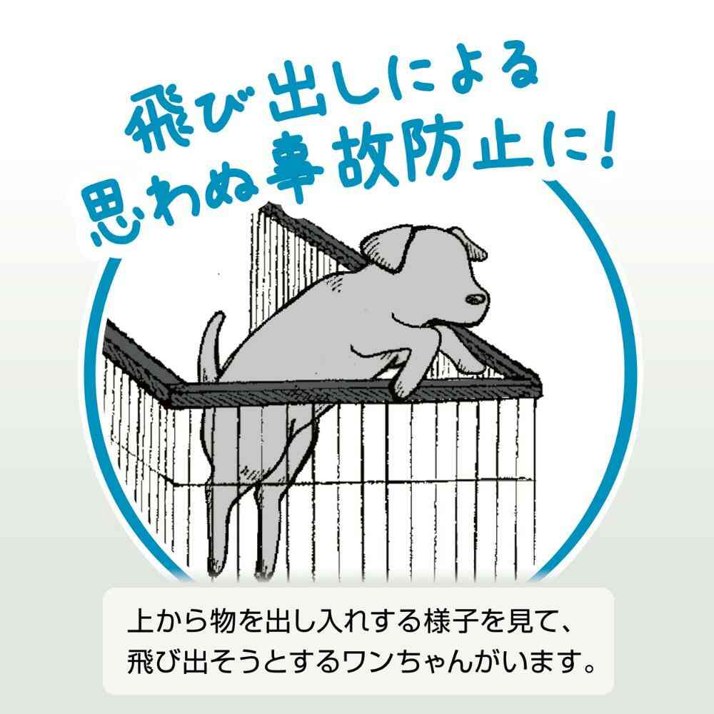 ・ワンちゃんの飛び出し防止に! ・用途に応じて開閉、着脱が可能! ・トイレスペース、住居スペースそれぞれが自由に開閉。 ・着脱簡単アタッチメント付。片手で操作できるロック機構。