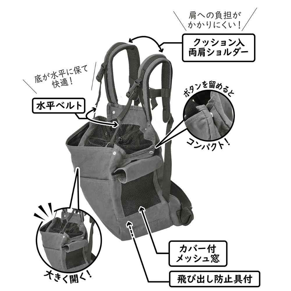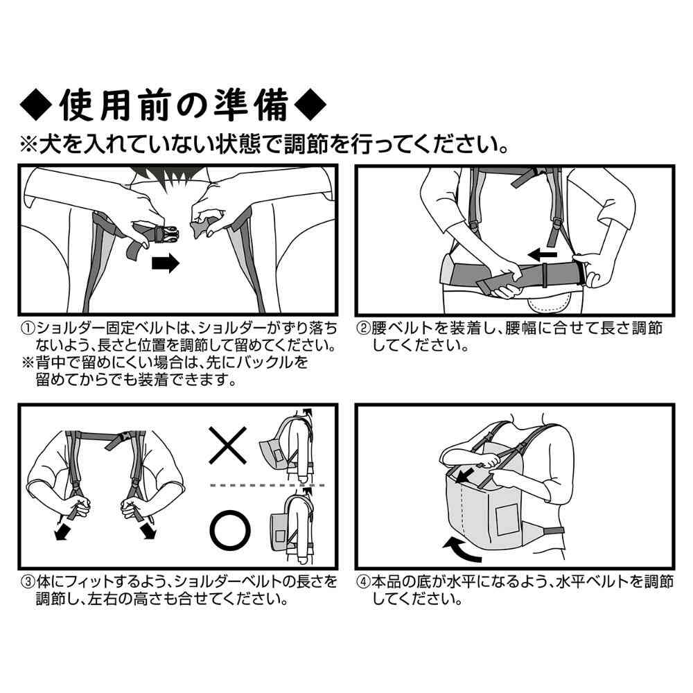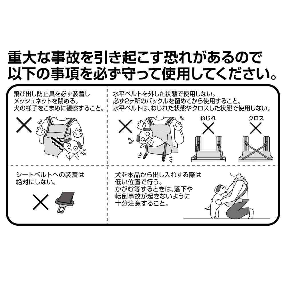 ・本品は犬用です。犬の移動以外の用途には使用しないでください。 ・記載以上の体重の犬には使用しないでください。 ・人やペットが破片等を誤飲しないように注意してください。万一、誤飲した場合は各医師に相談してください。 ・空袋は幼児・子供・ペットがおもちゃにしないように注意してください。 ・幼児・子供には絶対に使用させないでください。 ・本品を正しく使用してください。使用方法の誤りや分解・修理・改造等による事故については、一切責任を負いません。 ・本品の中に人が入らないでください。 ・本品を使用したまま車両等の運転をしないでください。 ・犬を長時間入れた状態にしないでください。 ・本品に犬を入れた状態で車中に放置しないでください。特に夏季は車中が高温になりますので注意してください。 ・犬の様子をこまめに観察しながら使用してください。 ・飼い主の目の届く範囲で使用してください。 ・落下や転倒事故が起きないように十分注意してください。 ・足元が見えにくいので気をつけてください。 ・使用前に破損箇所がないか必ず確認し、傷みや破損がある場合は使用を中止してください。 ・犬が嫌がる場合は、無理に使用しないでください。 ・事故や破損の原因になりますので、ペットが本品をかんだり、引っかく等しないように注意してください。 ・犬が逃げ出さないように、開閉には注意してください。 ・使用時には飛び出し防止具を首輪等に装着し、メッシュネット部を閉めてください。 ・腰ベルト・ショルダー固定ベルト・水平ベルトのバックルが確実に留められていることを確認してから使用してください。 ・バックルを留める際は、手や毛をはさまないように注意してください。 ・汗・水ぬれや摩擦等で色落ちする場合があります。特に薄い色の服や薄い毛色の犬には注意してくだい。 ・床面の材質等によっては底面のボタンのキズ・跡等が残る場合がありますので注意してください。 ・火気や水気のそばでの使用や保管はしないでください。 ・幼児・子供・認知症の方・ペットのふれない所に保管してください。 ・使用後はいつも清潔に保ってください。汚れた場合は乾いた布等でふき取ってください。 ・熱湯・漂白剤・ベンジン・シンナー・アルコール等は使用しないでください。 ・長期間使用しない場合は、型くずれしないように注意して保管してください。 ・火気や水気のそば・直射日光・高温多湿の場所をさけて保管してください。 ・幼児・子供・認知症の方・ペットのふれない所に保管してください。