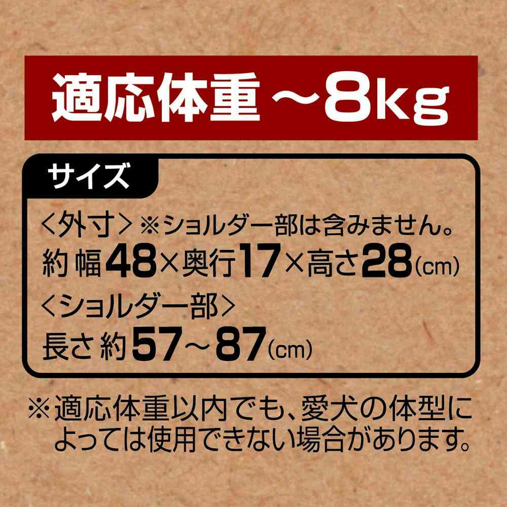 ・本品は犬用です。犬の移動以外の用途には使用しないでください。 ・記載以上の体重の犬には使用しないでください。 ・人やペットが破片等を誤飲しないように注意してください。万一、誤飲した場合は各医師に相談してください。 ・空袋は幼児・子供・ペットがおもちゃにしないように注意してください。 ・幼児・子供には絶対に使用させないでください。 ・本品を正しく使用してください。使用方法の誤りや分解・修理・改造などによる事故については、一切責任を負いません。 ・本品の中に人が入らないでください。 ・本品を使用したまま車両等の運転をしないでください。 ・犬を長時間入れた状態にしないでください。 ・本品に犬を入れた状態で車中に放置しないでください。特に夏季は車中が高温になりますので注意してください。 ・犬の様子をこまめに観察しながら使用してください。 ・飼い主の目の届く範囲で使用してください。 ・落下や転倒事故が起きないように十分注意してください。 ・足元が見えにくいので気をつけてください。 ・使用前に破損箇所がないか必ず確認し、傷みや破損がある場合は使用を中止してください。 ・犬が嫌がる場合は、無理に使用しないでください。 ・事故や破損の原因になりますので、ペットが本品をかんだり、引っかく等しないように注意してください。 ・犬が逃げ出さないように、開閉には注意してください。 ・使用時には飛び出し防止具を装着し、メッシュネット部を閉めてください。 ・汗・水ぬれや摩擦等で色落ちする場合があります。特に薄い色の服や薄い毛色の犬には注意してください。 ・火気や水気のそばでの使用や保管はしないでください。 ・幼児・子供・認知症の方・ペットのふれない所に保管してください。 ・使用後はいつも清潔に保ってください。本体を洗濯する場合は、品質表示マークに従ってください。 ・飛び出し防止具・メッシュネットストッパー・底板は洗えません。汚れた場合は乾いた布等でふき取ってください。 ・変形や収縮・変質の恐れがありますので、乾燥機やドライヤー等は使用しないでください。 ・熱湯・漂白剤・ベンジン・シンナー・アルコール等は使用しないでください。 ・洗濯により色落ちする場合がありますので、他のものとは一緒にしないでください。 ・長期間使用しない場合は、型くずれしないように注意して保管してください。 ・火気や水気のそば・直射日光・高温多湿の場所をさけて保管してください。 ・幼児・子供・認知症の方・ペットのふれない所に保管してください。 ・直射日光・高温多湿の場所をさけて保管してください。