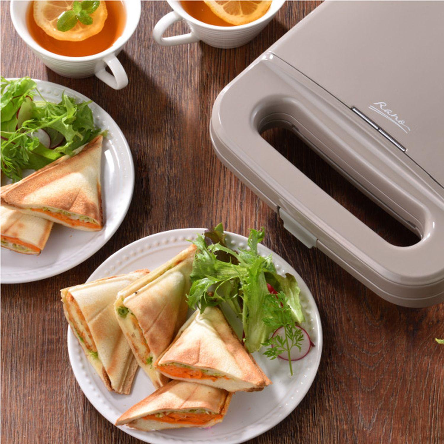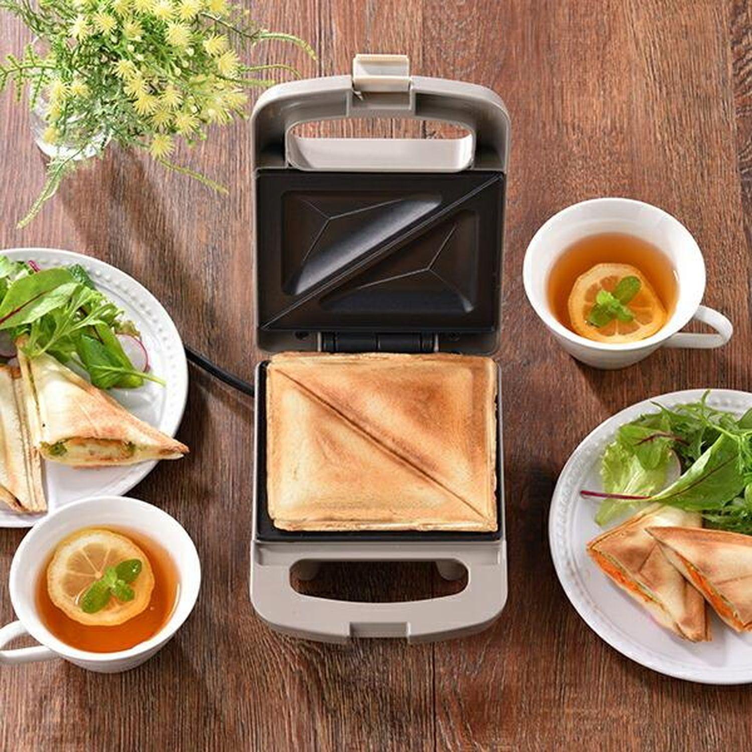 手軽にホットサンドキッチンに溶け込む落ち着いたカラーのホットサンドメーカー。パン耳を切らずに、ボリュームたっぷりのホットサンドが1度に2個作れます。プレートの内面はこびりつきにくく、汚れも落としやすいふっ素樹脂加工。Sサイズは食パン1枚分焼けます。【仕様】定格:AC100V-320W(50/60Hz)●コードの長さ1.1m