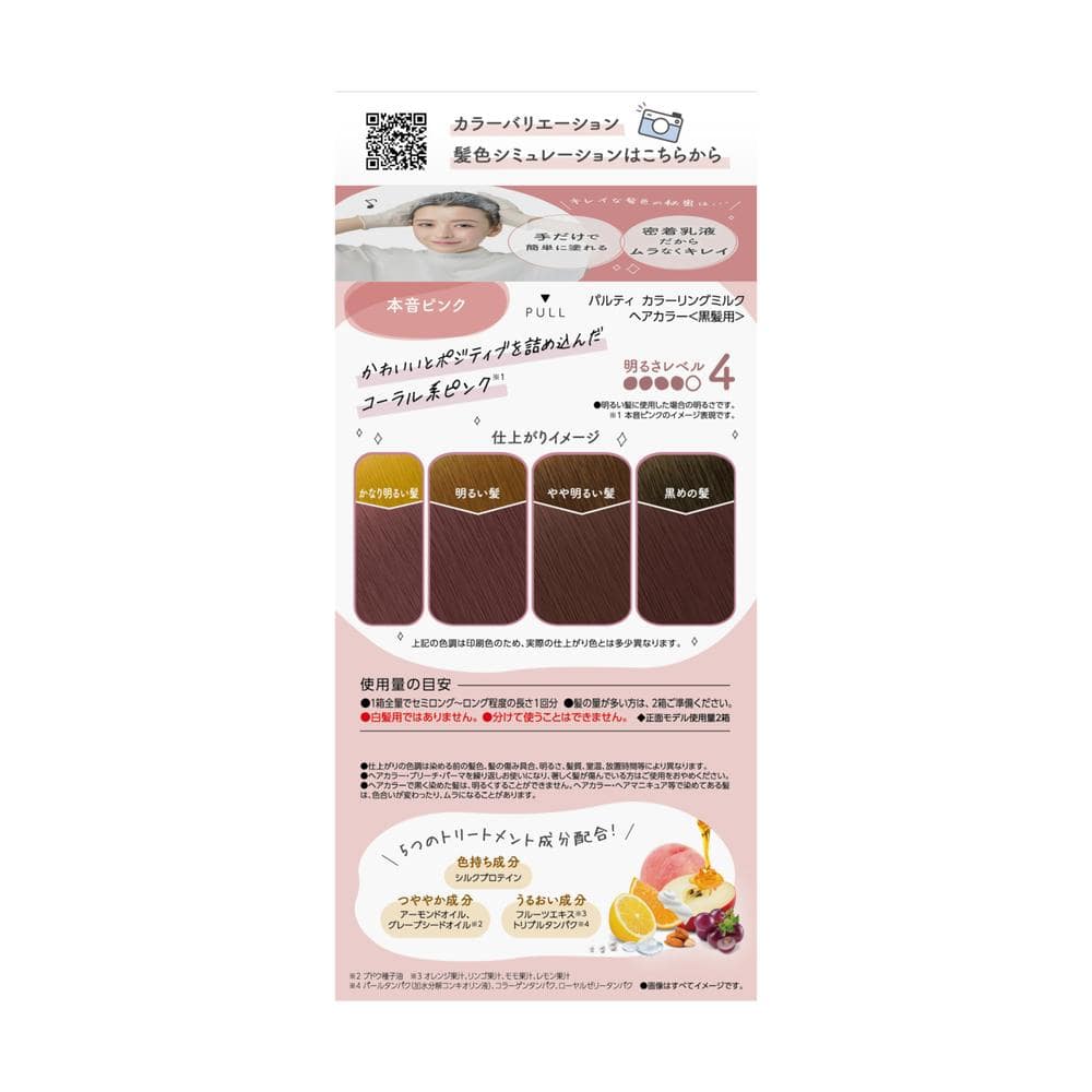 1剤 [有効成分]:トルエン-2,5-ジアミン、パラアミノフェノール、5-アミノオルトクレゾール [その他の成分]:亜硫酸ナトリウム、アルモンド油、イソステアロイル加水分解コラーゲン・アミノメチルプロパンジオール塩、エタノール、エデト酸四ナトリウム四水塩、塩化アルキルトリメチルアンモニウム、オレンジ果汁、加水分解コンキオリン液、加水分解シルク液、加水分解ローヤルゼリータンパク液、強アンモニア水、ステアリルアルコール、精製水、セタノール、セチル硫酸ナトリウム、濃グリセリン、ブドウ種子油、ポリ塩化ジメチルジメチレンピロリジニウム液、ポリオキシエチレンセチルエーテル、メチルポリシロキサン、モノエタノールアミン、モモ果汁、流動パラフィン、リンゴ果汁、レゾルシン、レモン果汁、L-アスコルビン酸、香料 2剤 [有効成分]:過酸化水素 [その他の成分]:ジエチレングリコールモノエチルエーテル、精製水、セタノール、セチル硫酸ナトリウム、ヒドロキシエタンジホスホン酸液、フェノキシエタノール、プロピレングリコール、リン酸、リン酸水素二ナトリウム ヘアトリートメントセラムN 水、PG、ジメチコン、BG、ミリスチルアルコール、エタノール、エチルヘキシルグリセリン、グリセリン、ステアルトリモニウムクロリド、ツバキ種子油、ヒドロキシエチルセルロース、フェノキシエタノール、ベヘントリモニウムクロリド、ユチャ油、EDTA-2Na、香料