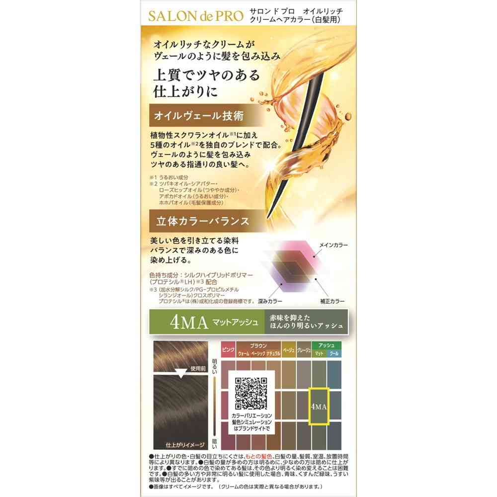 1剤 [有効成分]:塩酸2,4-ジアミノフェノキシエタノール、トルエン-2,5-ジアミン、レゾルシン [その他の成分]:アボカド油、亜硫酸ナトリウム、エタノール、エデト酸四ナトリウム四水塩、塩化アルキルトリメチルアンモニウム、塩化ジメチルジアリルアンモニウム・アクリル酸共重合体液、(加水分解シルク/PG-プロピルメチルシランジオール)クロスポリマー、カンゾウエキス、高重合メチルポリシロキサン(1)、植物性スクワラン、シア脂、常水、ステアリルアルコール、精製水、セタノール、ツバキ油、濃グリセリン、ホホバ油、ポリ塩化ジメチルジメチレンピロリジニウム液、ポリオキシエチレンセチルエーテル、メチルポリシロキサン、モノエタノールアミン、流動パラフィン、ローズヒップ油、DL-リンゴ酸ナトリウム、L-アスコルビン酸 2剤 [有効成分]:過酸化水素 [その他の成分]:高重合メチルポリシロキサン(1)、ジエチレングリコールモノエチルエーテル、水酸化カリウム、精製水、ヒドロキシエタンジホスホン酸液、フェノキシエタノール、ポリエチレングリコール400、ポリオキシエチレンステアリルエーテル、ポリオキシエチレンセチルエーテル、メチルポリシロキサン、流動パラフィン