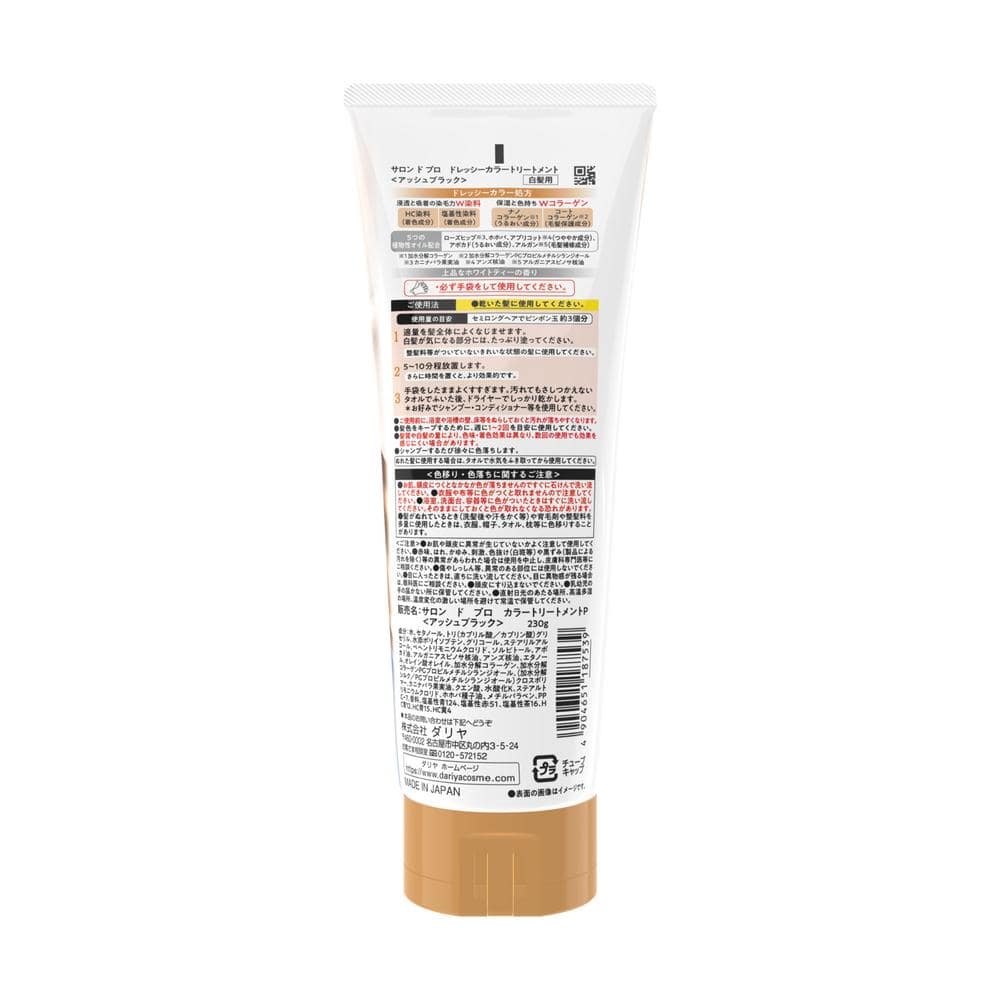 水、セタノール、トリ(カプリル酸/カプリン酸)グリセリル、水添ポリイソブテン、グリコール、ステアリルアルコール、ベヘントリモニウムクロリド、ソルビトール、アボカド油、アルガニアスピノサ核油、アンズ核油、エタノール、オレイン酸オレイル、加水分解コラーゲン、加水分解コラーゲンPGプロピルメチルシランジオール、(加水分解シルク/PGプロピルメチルシランジオール)クロスポリマー、カニナバラ果実油、クエン酸、水酸化K、ステアルトリモニウムクロリド、ホホバ種子油、メチルパラベン、PPG-7、香料、塩基性青124、塩基性赤51、塩基性茶16、HC青12、HC青15、HC黄4