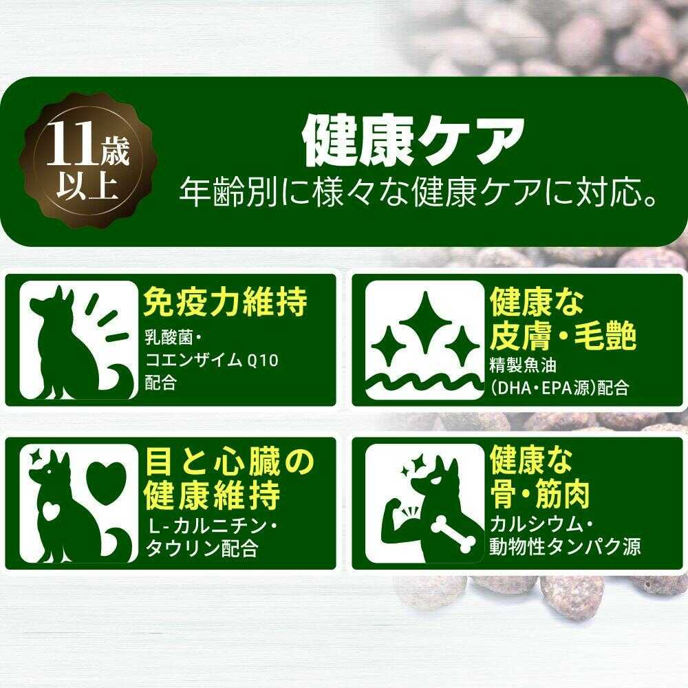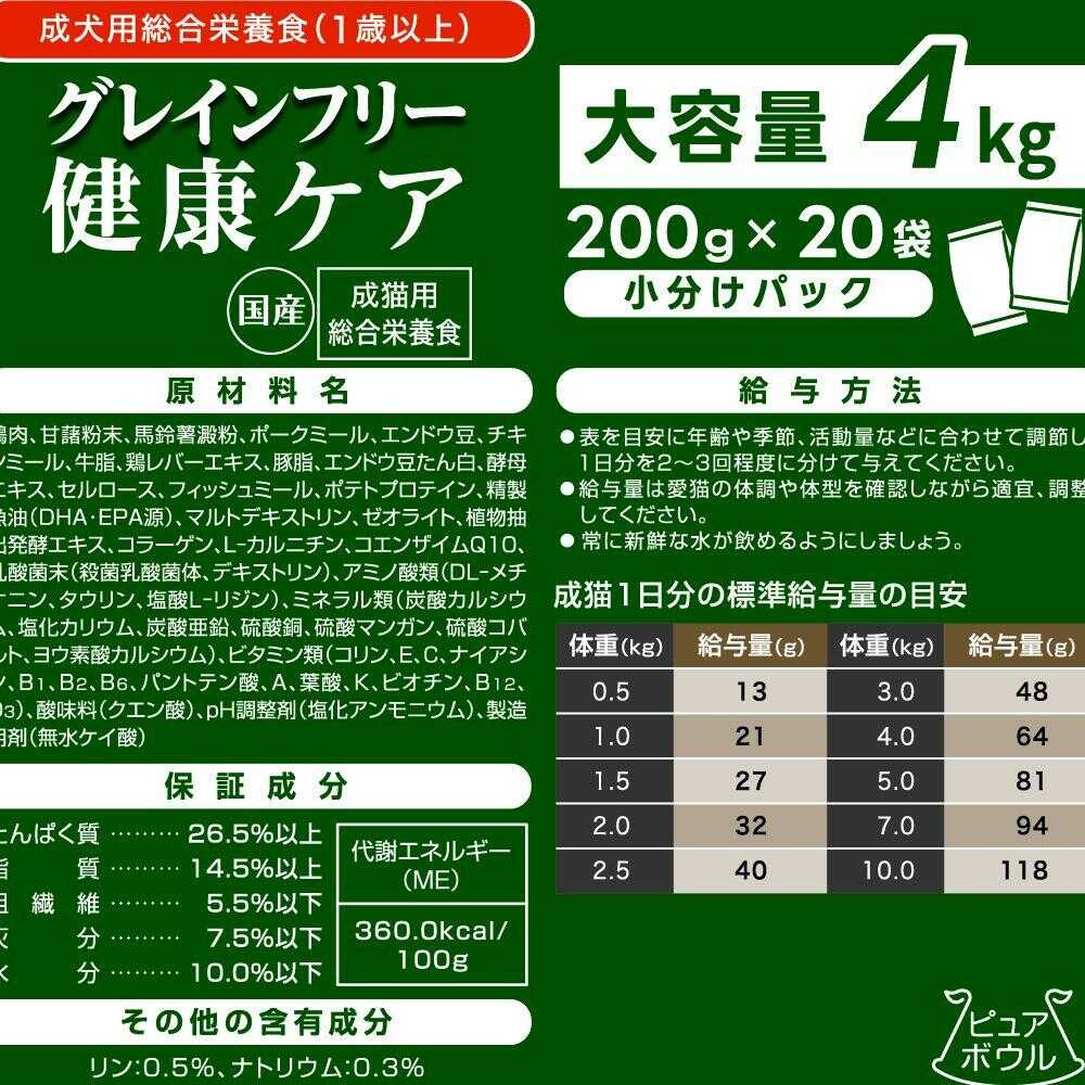 鶏肉、甘藷粉末、馬鈴薯澱粉、ポークミール、エンドウ豆、チキンミール、牛脂、鶏レバーエキス、豚脂、エンドウ豆たん白、酵母エキス、セルロース、フィッシュミール、ポテトプロテイン、精製魚油(DHA・EPA源)、マルトデキストリン、ゼオライト、植物抽出発酵エキス、コラーゲン、L-カルニチン、コエンザイムQ10、乳酸菌末(殺菌乳酸菌体、デキストリン)、アミノ酸類(DL-メチオニン、タウリン、塩酸L-リジン)、ミネラル類(炭酸カルシウム、塩化カリウム、炭酸亜鉛、硫酸銅、硫酸マンガン、硫酸コバルト、ヨウ素酸カルシウム)、ビタミン類(コリン、E、C、ナイアシン、B1、B2、B6、パントテン酸、A、葉酸、K、ビオチン、B12、D3)、酸味料(クエン酸)、pH調整剤(塩化 アンモニウム)、製造用剤(無水ケイ酸)