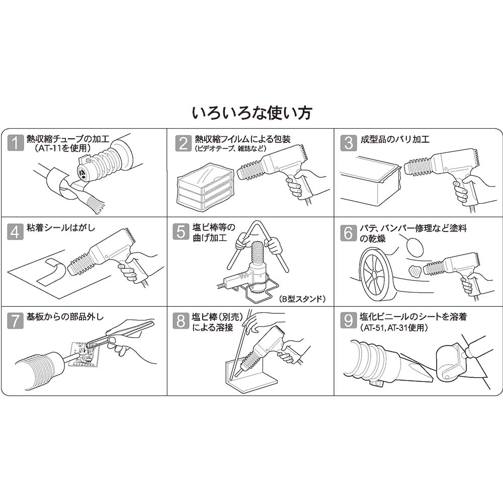 温度可変式で普及タイプの工業用熱風機です。 乾燥・溶解・過熱・熱収縮チューブ、シュリンク包装などの作業。 本体ボディーは鋼板製で、表面はクロームメッキ処理を施してあり、耐久性に優れています。 工業用ドライヤーとしてあらゆる産業の作業現場で使用されています。 ヒーター温度内部分布を安定させる改善を行い、約30%(従来機比較)の耐久性の向上を実現しました。 ヒーターワット数切換えと電圧をコントロールして熱風の調整が可能です(熱風温度が250~600度まで調整可能)。 ●消費電力:100V・1020W。 ●スイッチ:4段切換スイッチ(切・送・弱・強)。 ●温風温度:250~600度(可変)。 ●風量:0.18L/min。 ●風速:1000m/min。 ●サイズ:本体径70×長さ253×高さ200mm。 ●重量:約950g(電源コードを除く)。 ●電源コード有効長:約3m。 ●付属品:R型スタンド・フィルター。