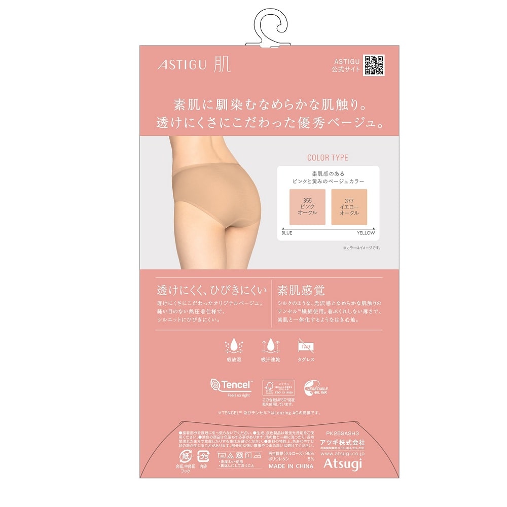 素肌に馴染むなめらかな肌触り。 透けにくさにこだわった優秀ベージュ。 素肌感覚。透けにくく、ひびきにくい。 吸放湿。吸汗速乾。 縫い目のない熱圧着仕様。 洗濯表示直接プリント。