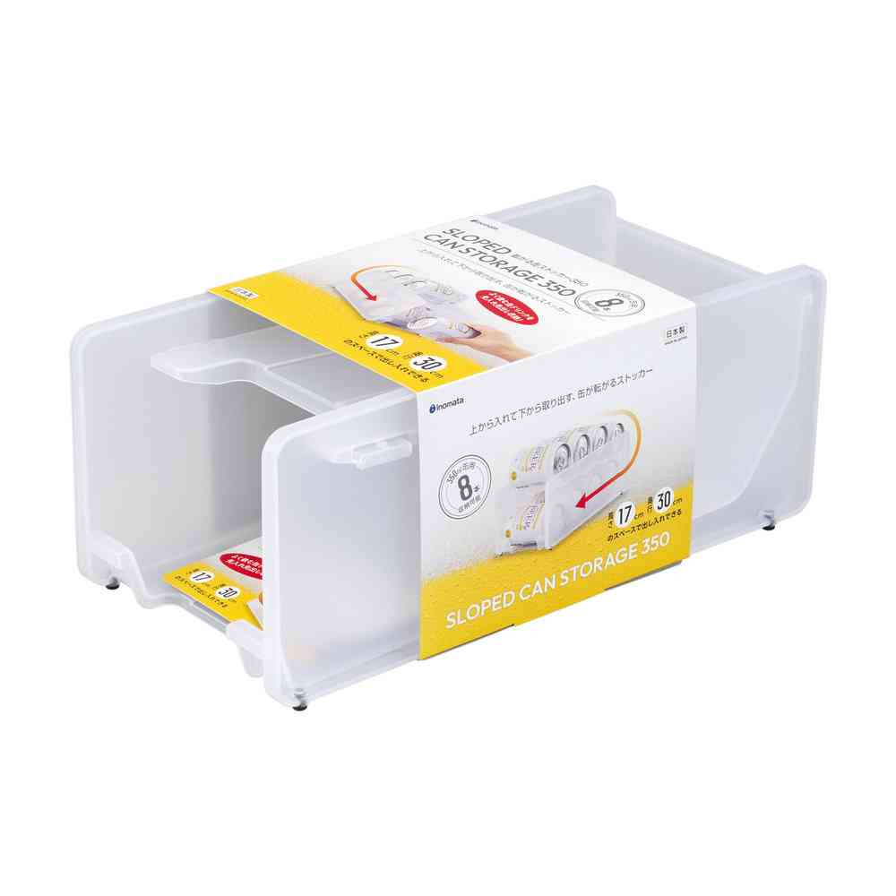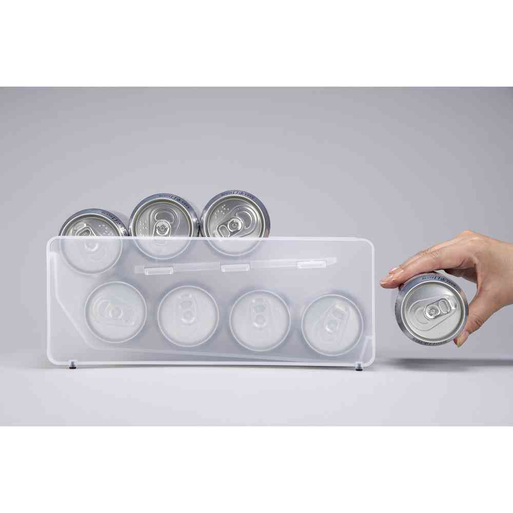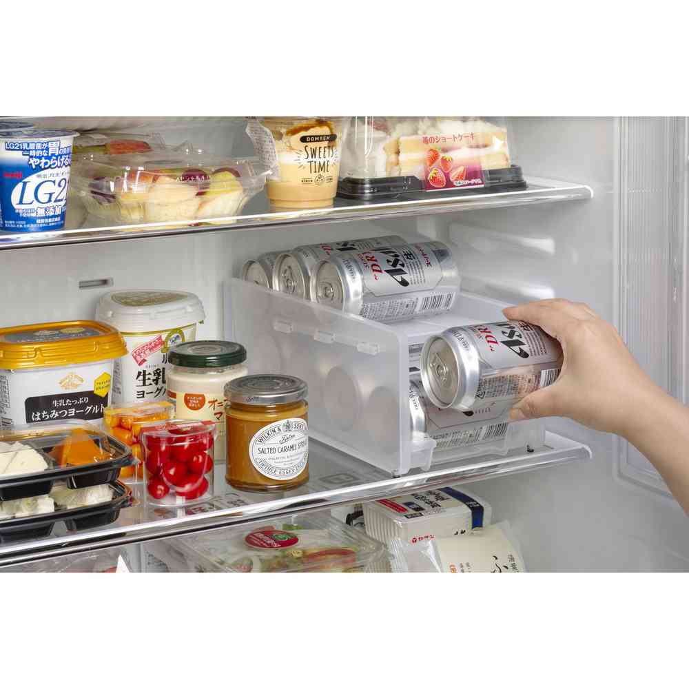 よく飲む缶ドリンクを先入れ先出し収納。 上から入れて、下から取り出す、缶がスムーズに転がるストッカー。 上の段の手前から缶を投入し、下段の手前から缶を取り出せる仕様。 缶が転がるよう傾斜がついており、滑らかにスムーズに転がるのが特徴です。 350ml缶が8本収納可能。 庫内スペース、高さ17cm奥行き30cmで使用できます。