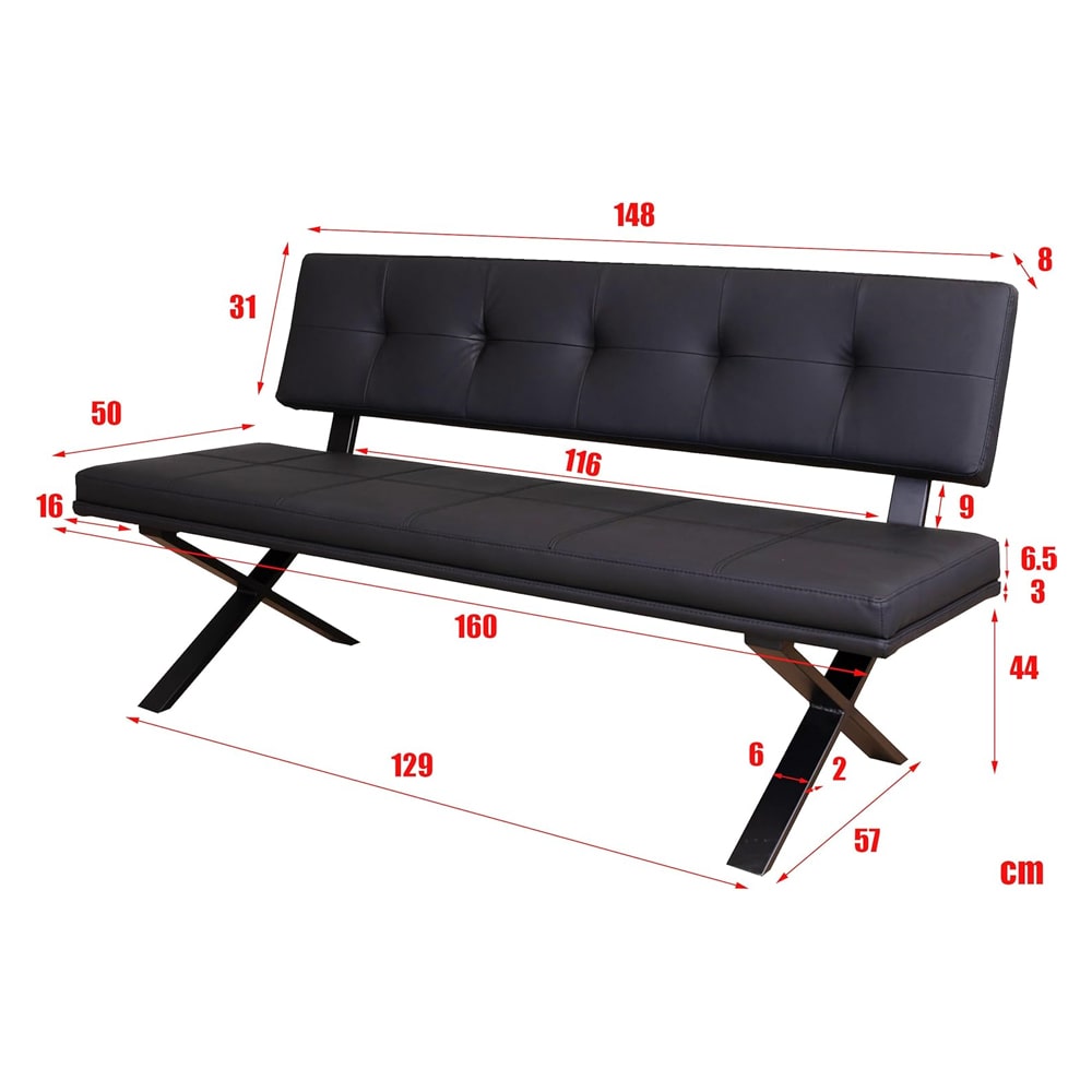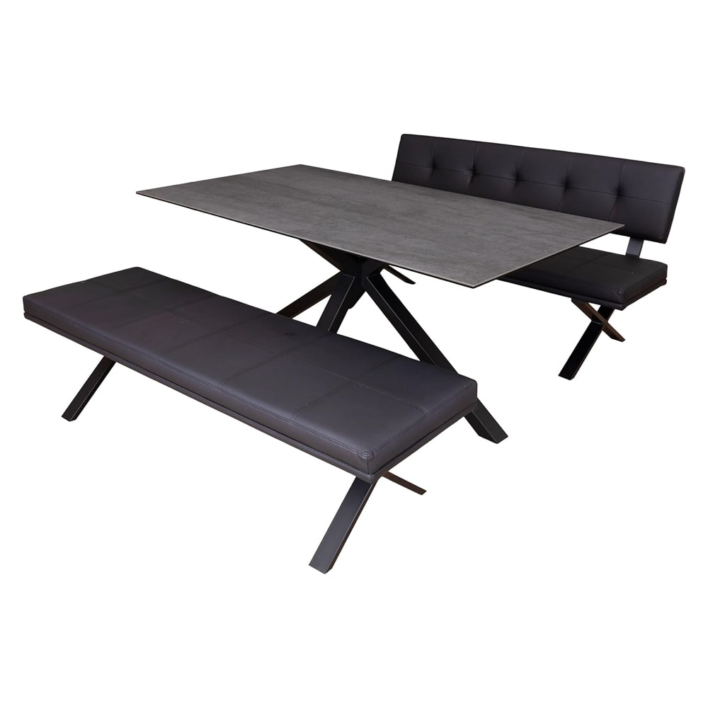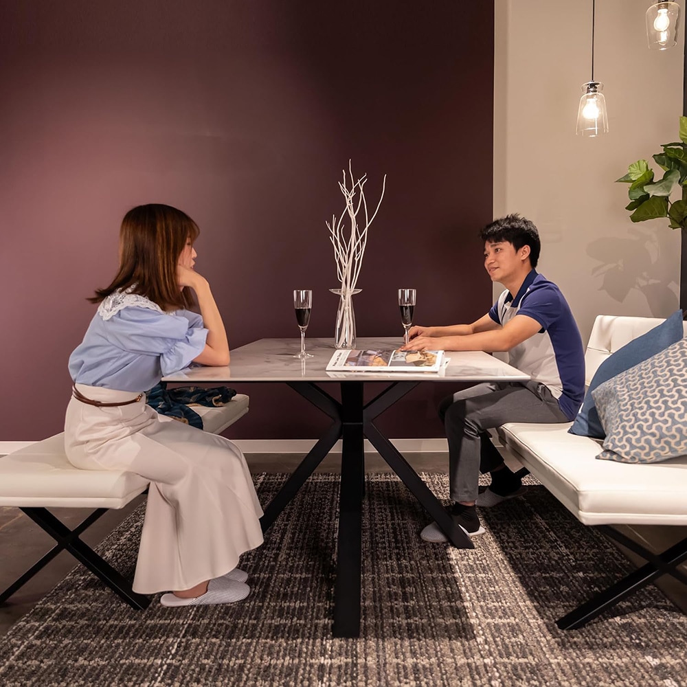 セラミック+強化ガラス天板・スチール脚、PVC張り込みベンチ