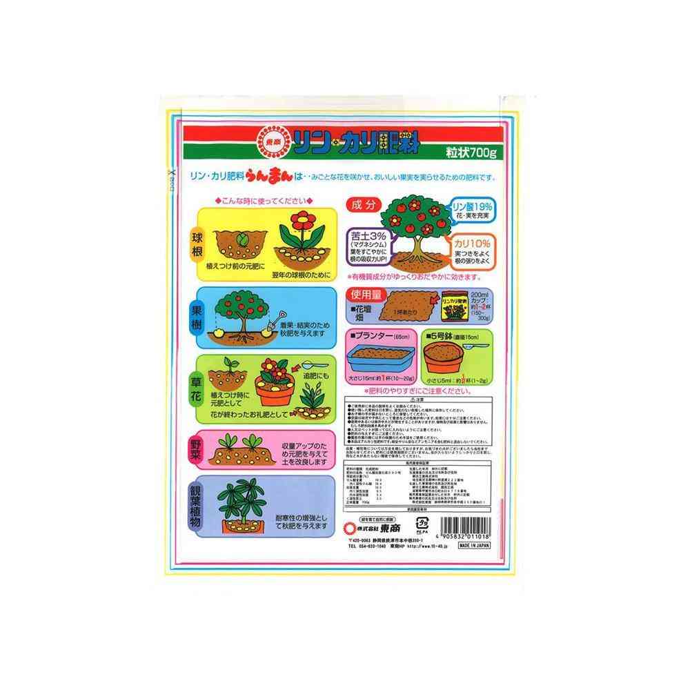 チッソ成分を含まない肥料をお探しの方に! 【特徴】 有機質由来のリン酸成分とカリが強化されているので、花付き、実付きが良くなります。 花、野菜、球根などに与えやすい粒状です。