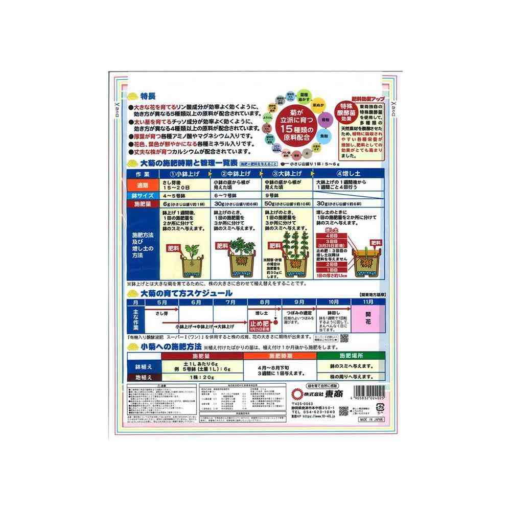 大菊作り・懸崖作りなど人に教えたくない菊作り専用の有機質肥料 【特徴】 有機の栄養いっぱいの「東商の醗酵油かす」を配合しているので、花が立派に育ちます。 アミノ酸、ミネラルの効果で葉が厚く育ちます。