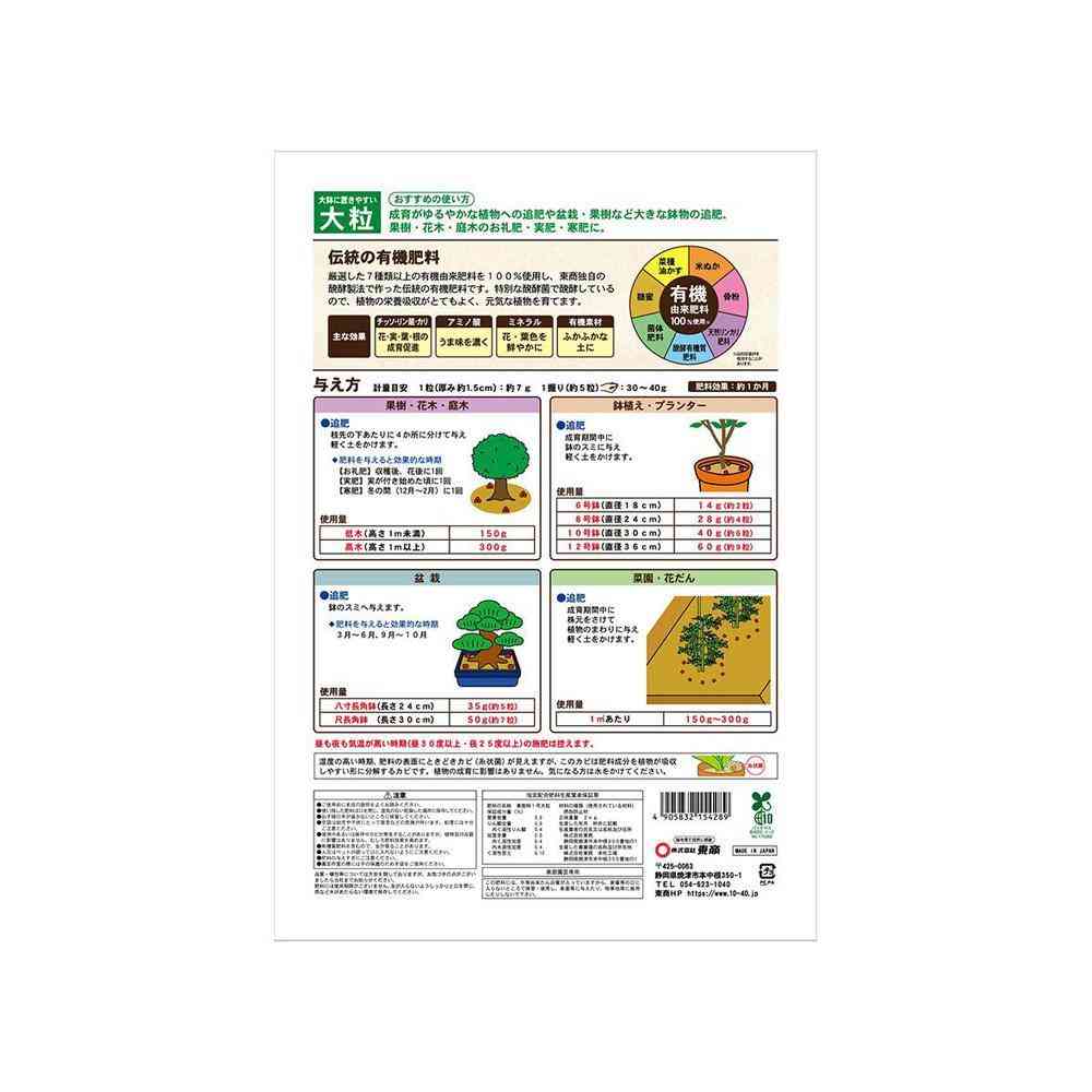 果樹・庭木・花木や盆栽など大きな鉢物の追肥に 【特徴】 厳選した7種類以上の有機由来肥料を100%使用し、東商独自の 醗酵製法で作った伝統の有機肥料です。特別な醗酵菌で醗酵している ので、植物の栄養吸収がとてもよく、元気な植物を育てます。