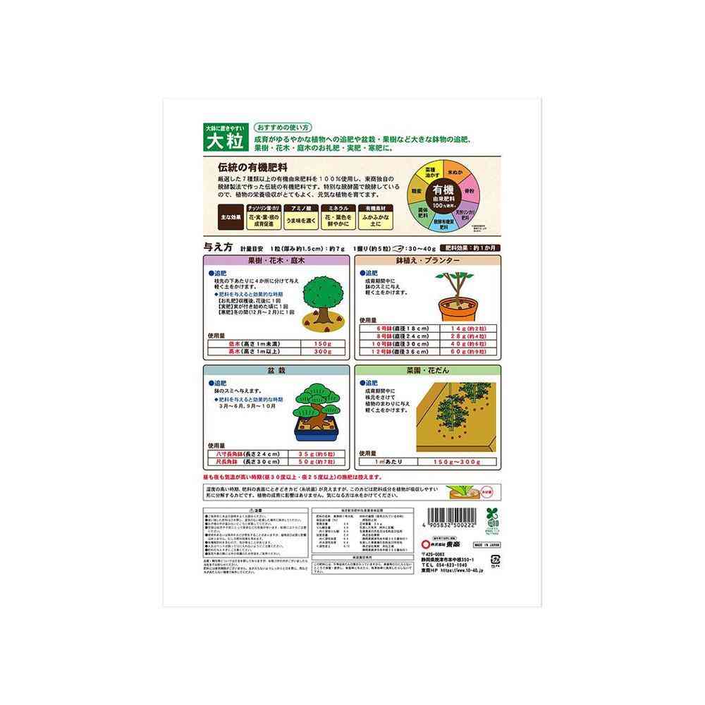 果樹・庭木・花木や盆栽など大きな鉢物の追肥に 【特徴】 厳選した7種類以上の有機由来肥料を100%使用し、東商独自の醗酵製法で作った伝統の有機肥料です。 特別な醗酵菌で醗酵しているので、植物の栄養吸収がとてもよく、元気な植物を育てます。