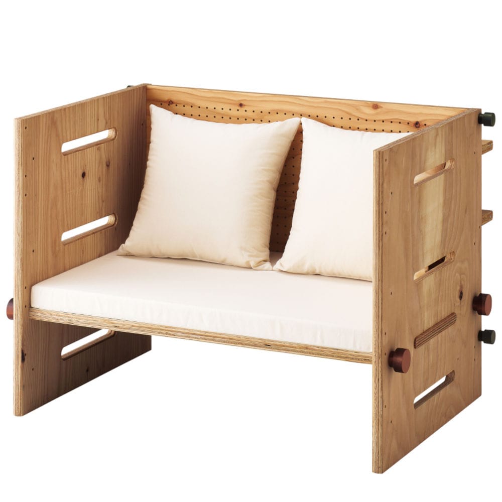 [本体] 構造部分/カラマツ材・メラミン化粧板 塗装/ウレタン塗装 接着剤/酢酸ビニル樹脂系エマルジョン系接着剤 [マットレス] 中材/ウレタンフォーム カバー生地/綿100%生成 [クッション2個] 中材・中袋/ポリエステル綿 カバー生地/綿100%生成