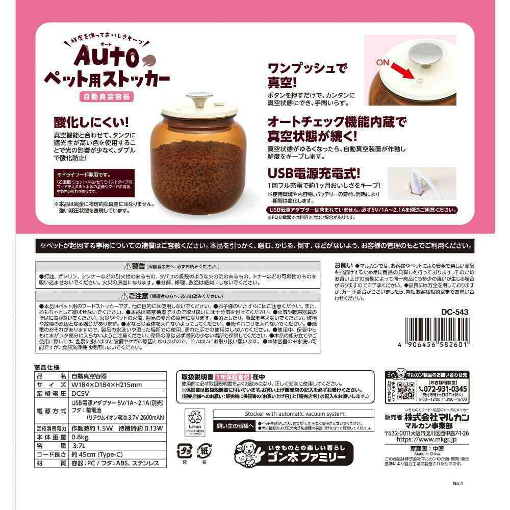 ・フードの鮮度や風味を維持する自動真空容器です。 ・ボタンを押すだけワンプッシュ!簡単に真空状態にでき手間いらず。 ・タンクに遮光性が高い色を使用することで光の影響が少ない。 ・真空状態がゆるくなったら、自動で真空装置が作動するオートチェック機能内蔵 ・USB電源充電式。1回フル充電で約1ヶ月おいしさキープ