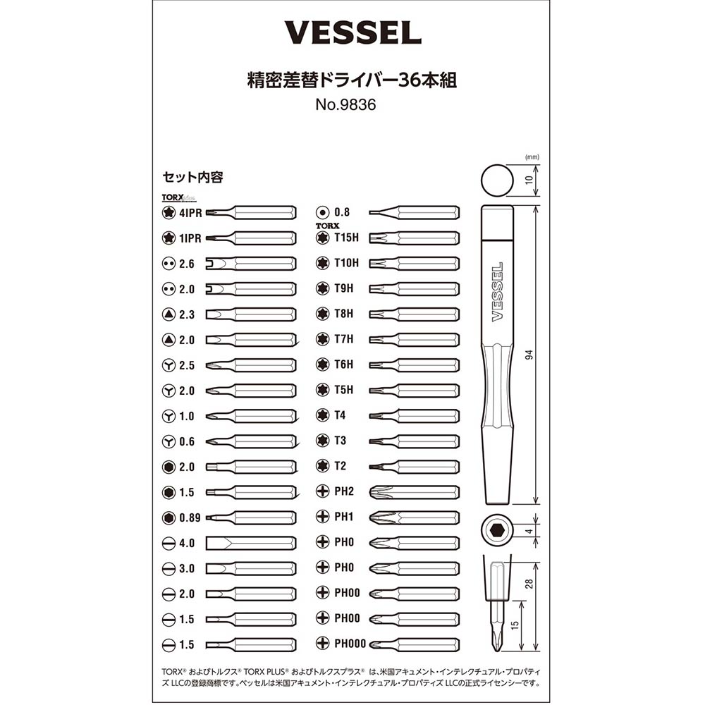 超精密小ネジ専用差替ドライバーに36本のビットをセットしました。 精密機器などのメンテナンス。 36本の精密ビットをセットしています。 アルミニウム合金製グリップは硬質アルマイト処理をしています。 スムーズに回転するエンドキャップで作業性が高いです。 ビットの交換はマグネット式で、強力な磁力で小さなネジを吸着します。 収納ケースは丸みを帯びたエッジで持ちやすく、スライド操作でふたが開き、そのふたが脚になり自立するのでビットが見やすく、選定や取り出しが容易に行えます。 ●ケース×1個。 ●グリップ×1本。 ●精密ビット×36本。