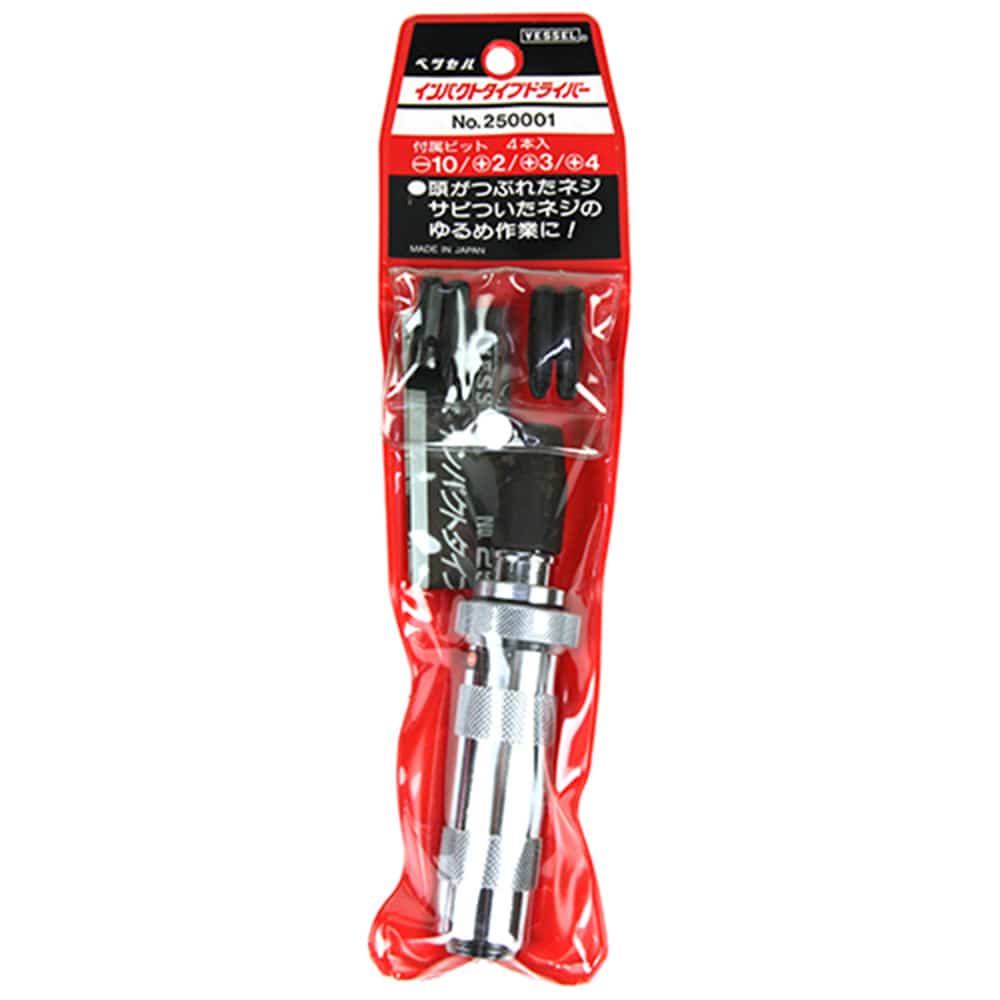 特に強く締めつける場合、さびついたネジを緩める場合に威力を発揮します。 ねじ締め作業。 自動車整備、機械器具の組み立て、分解に最適です。 重作業用です。 ビットアダプターを取りはずせば12.7mmのソケットが取付可能です。 ●全長:190mm。 ●ビットサイズ:(-)10・(+)2・(+)3・(+)4×36。 ●袋サイズ:325×80×38mm。