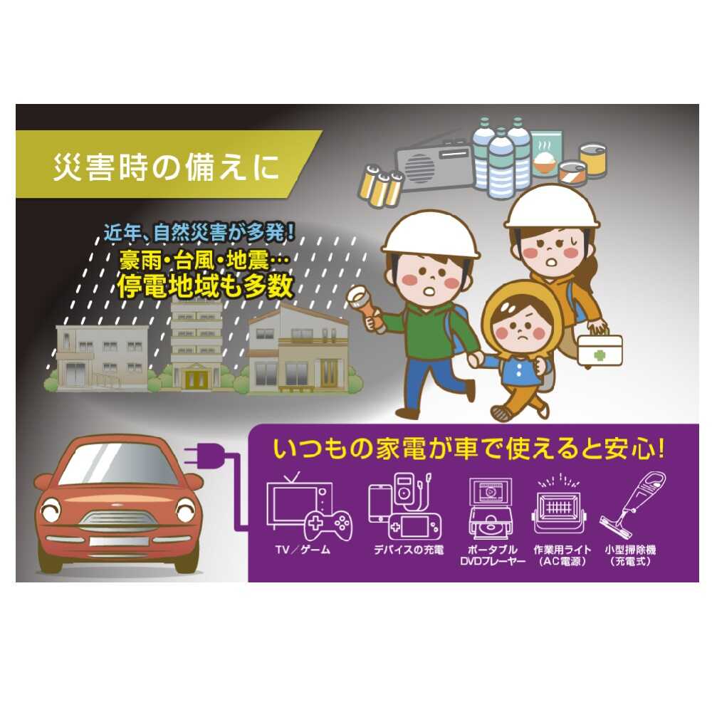 ※USBケーブルは付いておりません。各機器の純正ケーブルをご用意ください。 ※本製品は疑似正弦波でのAC出力となります。接続する機器により仕様ができない場合があります。 また、正弦波でのみ使用可能なAC100V製品に接続された場合、機器の故障につながる可能性があります。ご使用のAC100V機器の取扱説明書をご確認ください。 ※本製品は定格消費電力が300W以下の機器でも、起動時に300Wを超えてしまう機器にはご使用になれません。ご使用のAC100V機器の取扱説明書をご確認の上、ご使用ください。 ※定格出力が150Wを超えるAC100V製品をご使用の場合、本製品に付属の車載バッテリー接続ケーブルをご使用いただき、必ず車載バッテリーに接続してからご使用ください。 ※車載バッテリー接続用ケーブルをご使用の際は、必ずエンジンをかけた状態で使用してください。バッテリーあがりの原因となります。 ※車載バッテリー接続用ケーブルをご使用の際は、必ず停車した状態でご使用ください。 ※本製品は家庭用機器として設計されております。人命に直接関わる医療機器や、高い信頼性を要求されるシステムには絶対に使用しないでください。