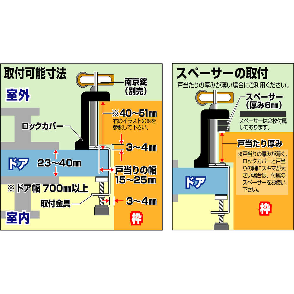 ●建物にキズを付けずに、南京錠で扉を施錠できます。●内開きドア専用です。●取付け金具は丈夫なステンレス製で、「ハの字」の設計で強度がUPしています。●※南京錠は別売です。●本体ロックカバー幅×奥行×高さ(mm):55×61×64●取付金具幅×奥行×高さ(mm):55×143×40 質量269g
