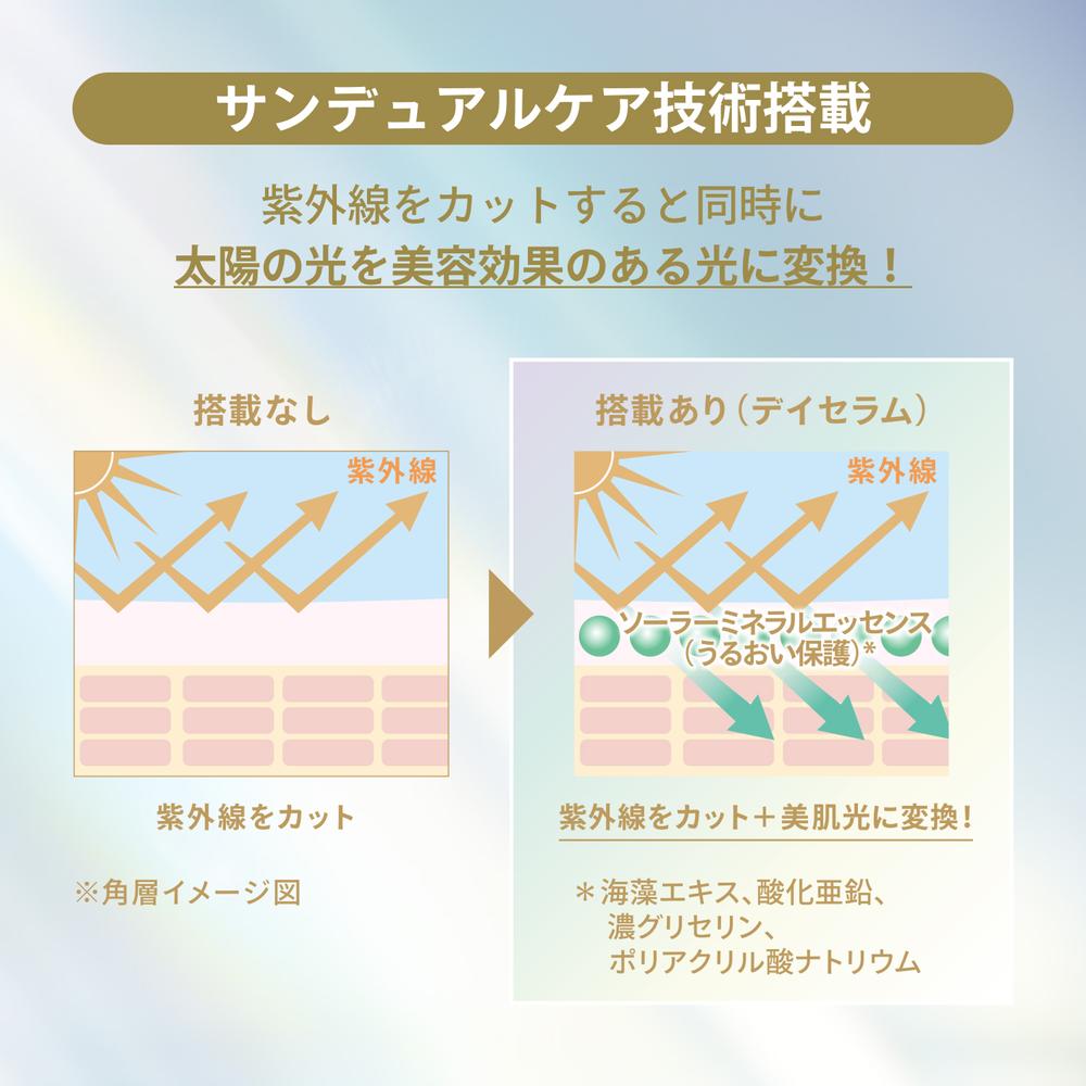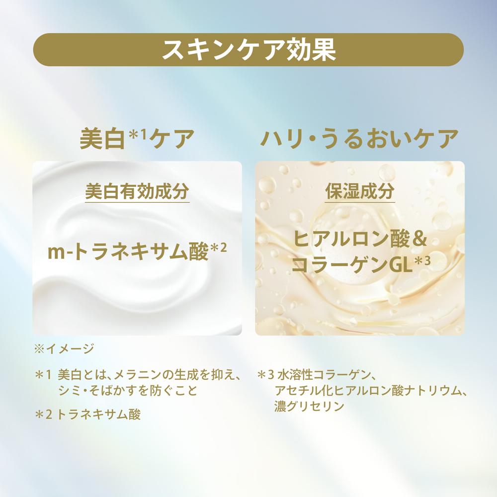 強力UVカットに、美白※ケア、トーンアップ仕上げまで叶える薬用UV美容乳液。ハリ・うるおいに満ちた透明感のある肌へ。 紫外線をブロックすると同時に、美容効果のある光に変換する技術搭載。 美白有効成分配合。化粧持ち持続効果。顔用。ウォータープルーフ。 ※メラニンの生成を抑え、シミ・そばかすを防ぐ ≪ご使用について≫ ●2層タイプなので、振って音がしてから、さらに5回程度振ってご使用ください。 ●朝のスキンケアで肌を整えた後、手のひらに適量をとり、顔全体になじませます。 ●使用量が少ないと、十分な紫外線防御効果が得られません。 ●落とすときには、メイク落としをご使用ください。