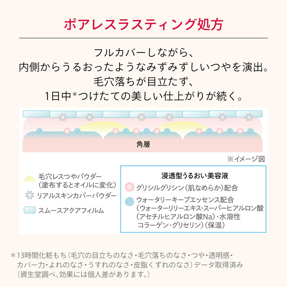 美容液でメイクする新発想で、使うたび、毛穴レスな「極上つるん肌」へ。 美容液でファンデ成分を包みこみ美容液が肌にずっとふれる独自技術「セラムファースト技術」を搭載した、ファンデ美容液。 毛穴や角層の奥までうるおいが届き、なめらかな肌へ。 毛穴・色ムラをしっかりカバーするのにみずみずしい使い心地。毛穴落ちが目立たず、1日中※つけたての美しい仕上がりが持続。 ※13時間 化粧もち ※※データ取得済み ※※毛穴の目立ちのなさ・毛穴落ちのなさ・つや・透明感・カバー力・よれのなさ・うすれのなさ・皮脂崩れのなさ (メーカー調べ。効果には個人差があります。)