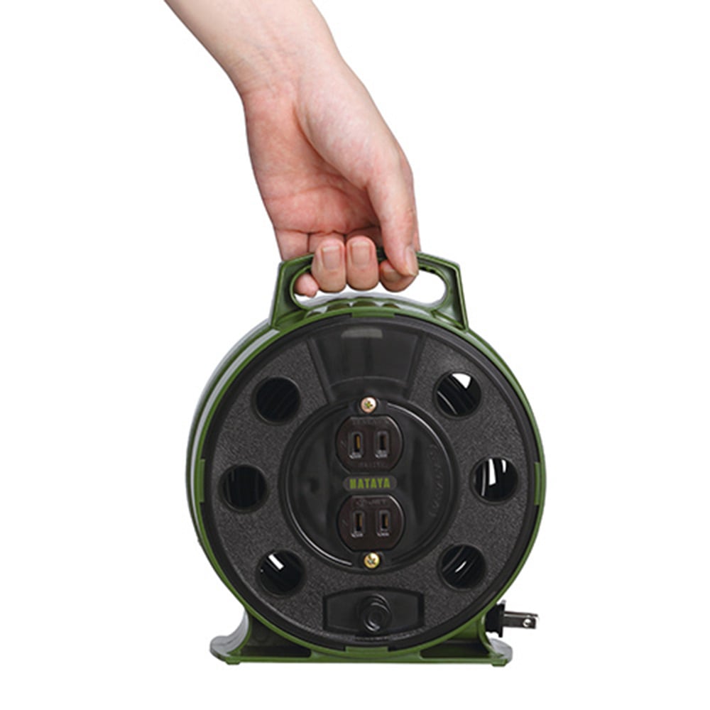 お部屋のインテリアにも馴染む、かわいい外観が特徴。収納や持ち運びに便利なコンパクト5m屋内用コードリールです。 リビングでの日常使いとして、掃除機やAV機器など家電の電源延長。 5mの延長コードを、たてよこ20cmの寸法に小さくまとめ、厚みもたったの9cmで屋内での収納や持ち運びの際にもかさばらないコンパクトコードリールです。 お部屋のインテリアにも馴染むオリーブグリーンカラーを採用し、見た目がかわいいのでリビングルームのインテイリアとして置いていただいてもお洒落です。 コードを全長引き出して最大1200Wまでの電気製品が使用できます。 ●電線長:5m。 ●製品定格(電線を巻いたままの状態で使用できる電流値):125V・6A。 ●コンセント仕様:2口x15Ax125V。 ●電線仕様:VCTFK1.25mm2x2芯。 ●温度センサー付き。 ●カラー:オリーブグリーン。 ●日本製。