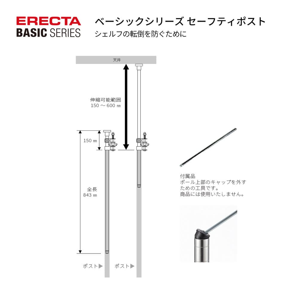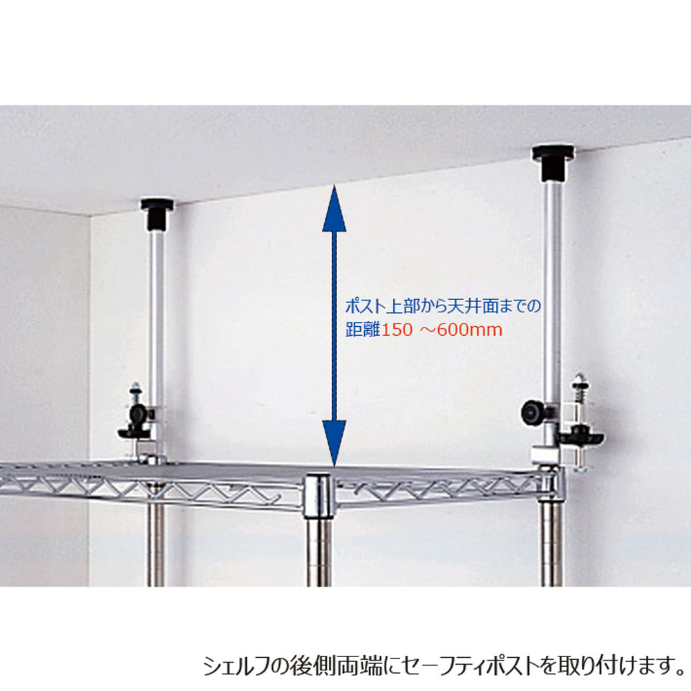 シェルフの転倒を防ぎます。シェルフのポール上部に取り付け、天井の面にテンションを与えることにより、シェルフの転倒を防止します。ダブルアクション方式でゆるみにくく、しっかり固定。セーフティポスト先端のゴム面を天井にあててロック。さらにダイアルを回し接地面にテンションを与えるダブルアクション方式なので、ゆるみにくく確実に固定できます。【仕様】互換性:スーパーシリーズ等、他のシリーズとの互換性はありません。●伸縮可能範囲:150~600mm(ラック本体上部から天井面までの距離が150~600mmの範囲内でご使用になれます。)