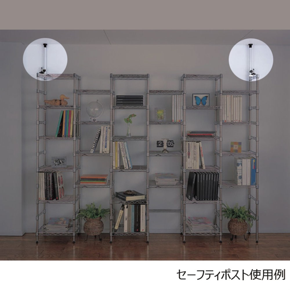 本製品は奥行きの狭いシェルフ、全高の高いシェルフの転倒を防止するためのパーツです。耐震基準に基づく地震転倒防止器具ではありません。※天井下地がない場所や、下からの圧力に弱い場所でのご使用は、お控えください。※必要以上のテンションをかけると天井が抜ける恐れがありますので、ご注意ください。※ポール上部のキャップをはずし、セーフティポストを差し込んでください。※セーフティポストは、ポール上部から天井面までの距離が150~600mmまでの範囲内でご使用になれます。(150 ~600mm の伸縮可能範囲でご使用になれるのは、ポストの高さが800mm 以上の場合です。)※後付けの場合は、ポール上部から天井までの間隔が狭いと、自立したままの取り付けが難しくなります。※キャスターを取り付けてのご使用はできません。