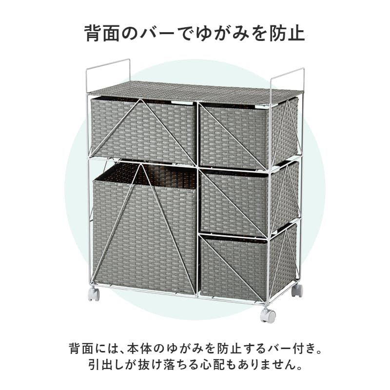 すっきりとした見た目のラタン調ランドリー収納。大きなかごは前に傾く設計で洗濯物の出し入れがしやすく、持ち運びにも便利な取っ手付き。