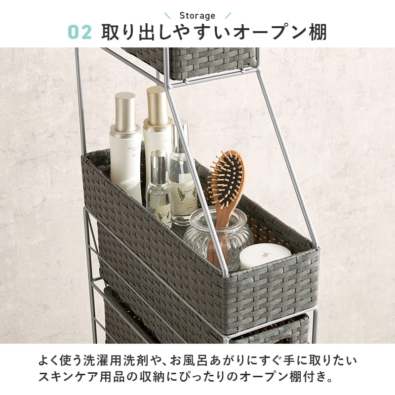 隙間におけるスリムなラタン調収納ラック。ハイタイプで引出しが多く、使用頻度によって使い分けができます。