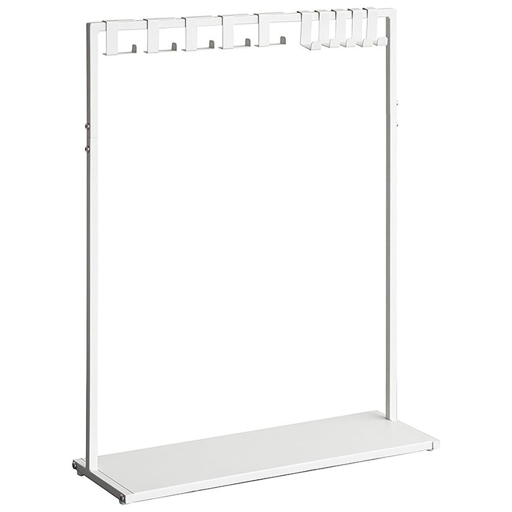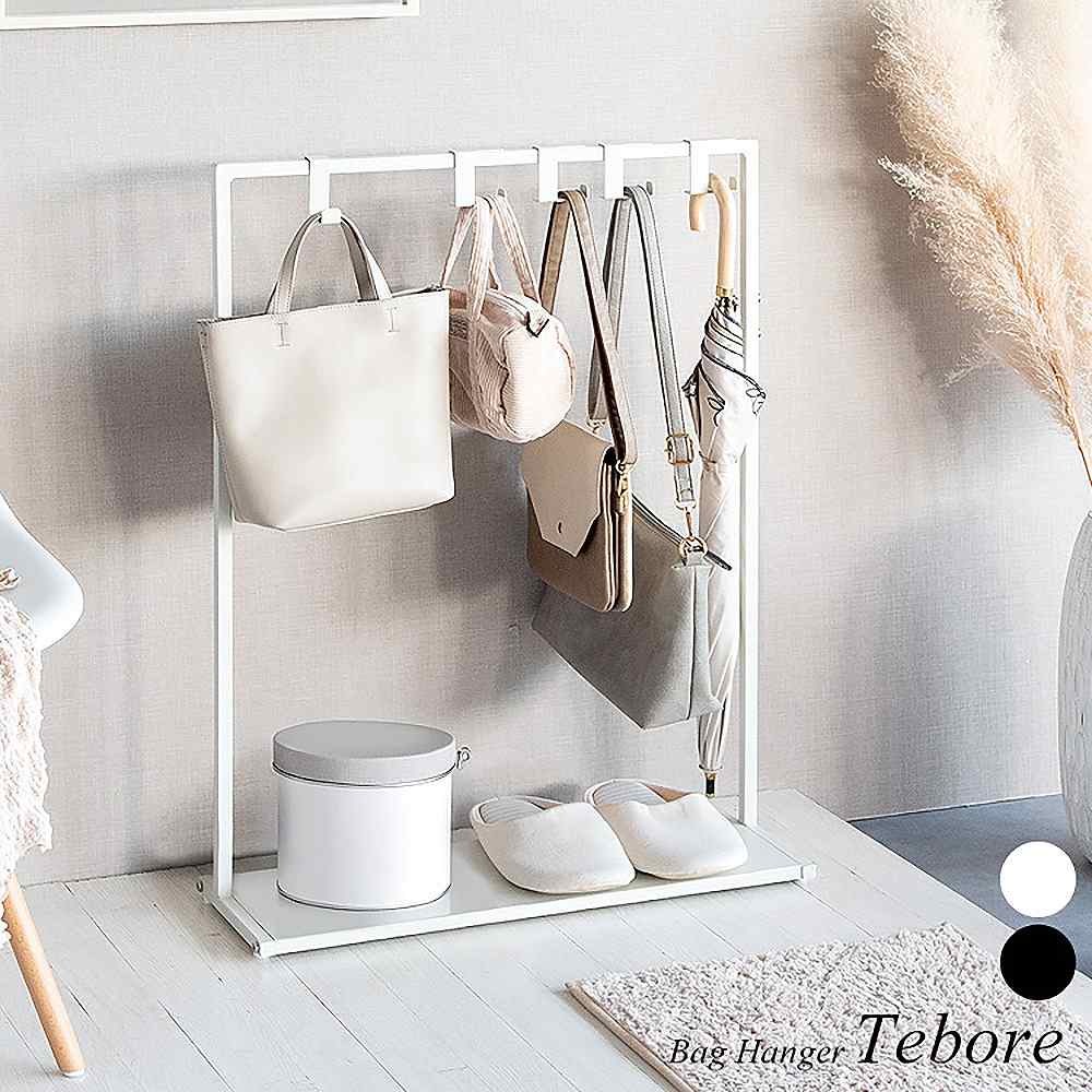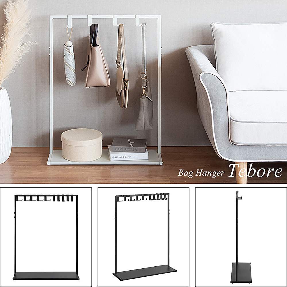 玄関や廊下の空いたスペースにカバンをまとめて置けるシンプルバッグハンガー『Tebore(テボーレ)』。 カバンのデザインで掛ける向きが選べる2種類のフックが各5本、計10本付属。下棚に小物も置けます。ランドセルも掛けられるので、お子さまにもオススメ。 製品重量:3kg